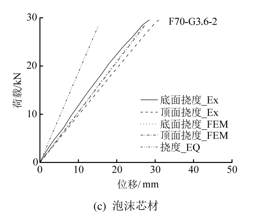 对应于木质芯材在20 kN、泡沫芯材在3 kN,以及各试件的试验极限荷载下,表3分别给出了试验实测、有限元和等效截面方法的夹层板底部跨中竖向挠度。图 5以 P48-Z6-G0、PS48-Z6-G0、P48-Z3-G3、P54-Z0-G3以及 F70-G3.6-2夹层板为例,给出了试验值、有限元和等效截面法计算获得的荷载-跨中挠度对比曲线。其中 F70-G3.6-2给出了试验和有限元法计算下上面层与底面层位移,以及等效截面法计算的等效位移。