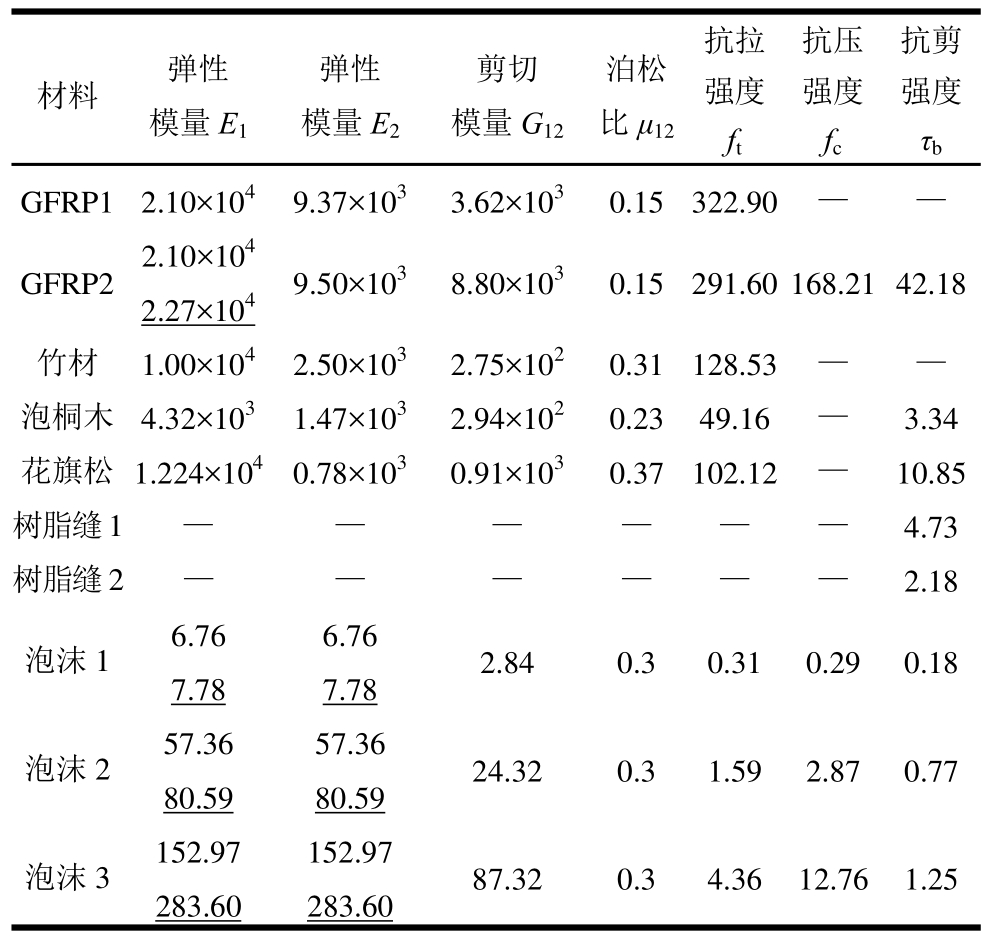 注:表中木材或竹材,下标1表示顺纹纵向,2表示横纹方向;对于GFRP则1表示沿板长度方向,2为横向;树脂缝1-竹与木树脂缝;树脂缝 2-其它树脂缝;泡沫 1-(密度 48 kg/m3);泡沫 2-(密度199 kg/m3);泡沫3-(密度413 kg/m3);除泊松比μ12外,所有材料其它参数单位均为MPa;-表示无此项数据。