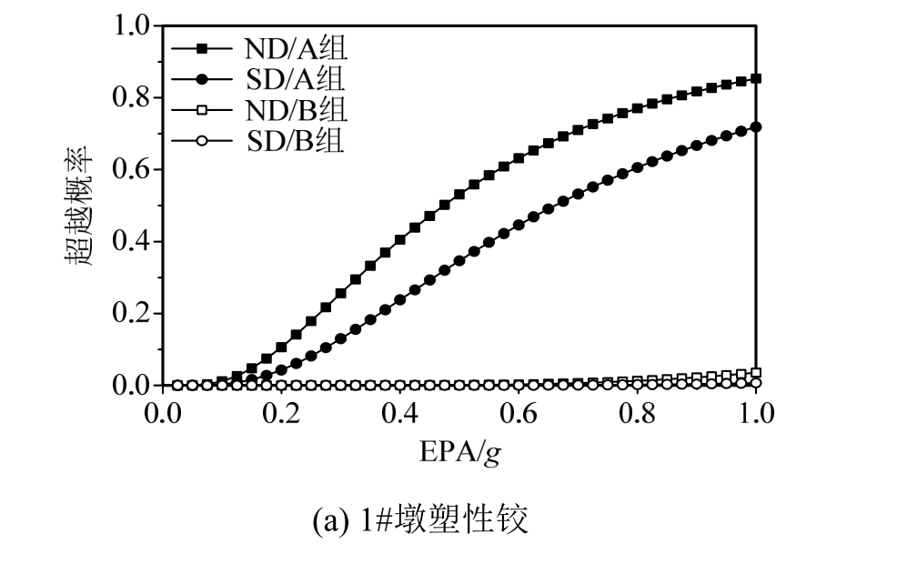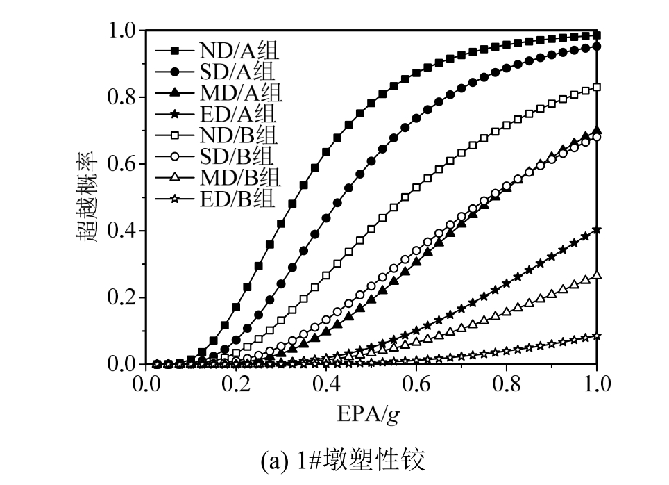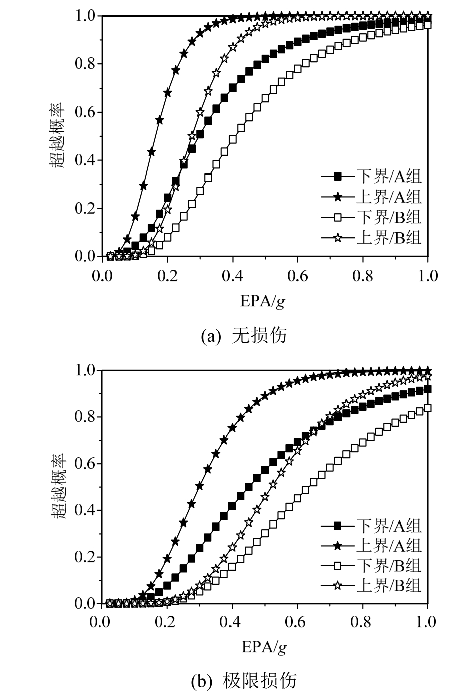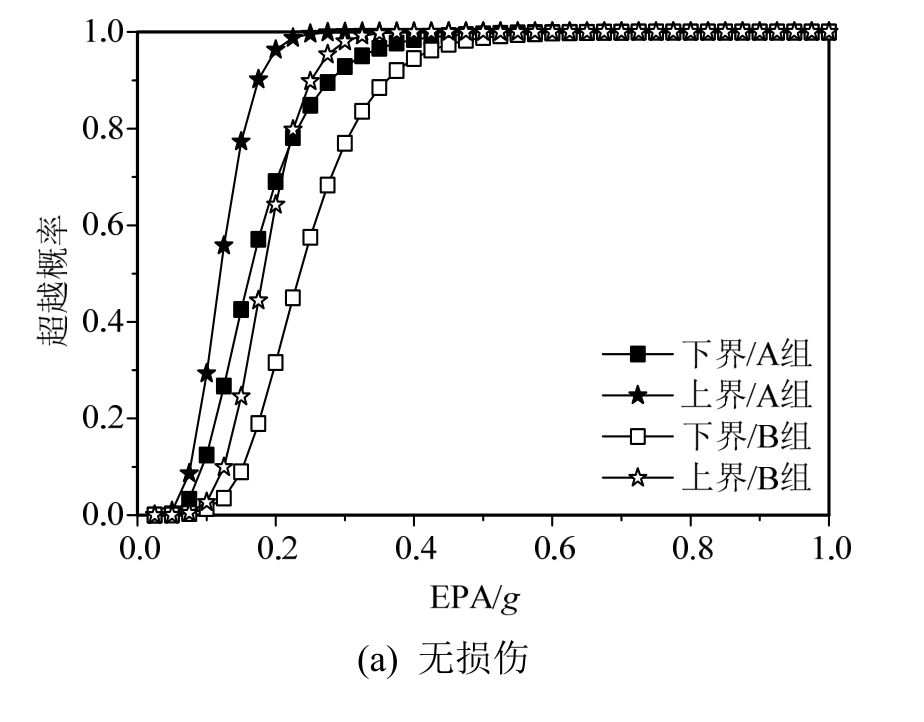 图8给出了纵向地震输入下此高架桥的系统易损性曲线,可以看出,由于纵桥向桥墩只会发生轻微损伤,高架桥纵桥向的系统易损性只用无损伤和极限损伤表示即可,而且极限损伤主要由2#固定墩顶支座的剪切失效所决定,主要表现为主梁失去纵向约束形成机动体系;同时,A组含速度脉冲的近断层地震动使得桥梁系统纵向发生各级损伤的概率大于B组远场地震动,其根本原因在于A组地震动输入下梁-台会发生更大的碰撞力,导致 2#固定墩顶的支座易发生纵向剪切失效。