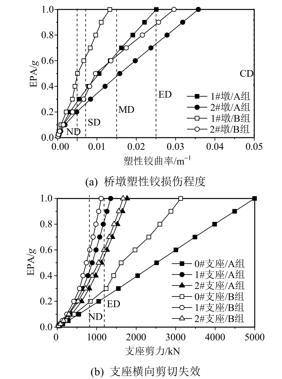 (2) 在进行高架桥易损性分析或评价时,仅以桥墩塑性铰曲率作为损伤指标是不够的,支座连接主梁和桥墩,若支座发生剪切破坏或者位移失效,会使桥梁形成机构体系,带来不可估量的震害,所以易损性分析要考虑多损伤指标的系统易损性。
