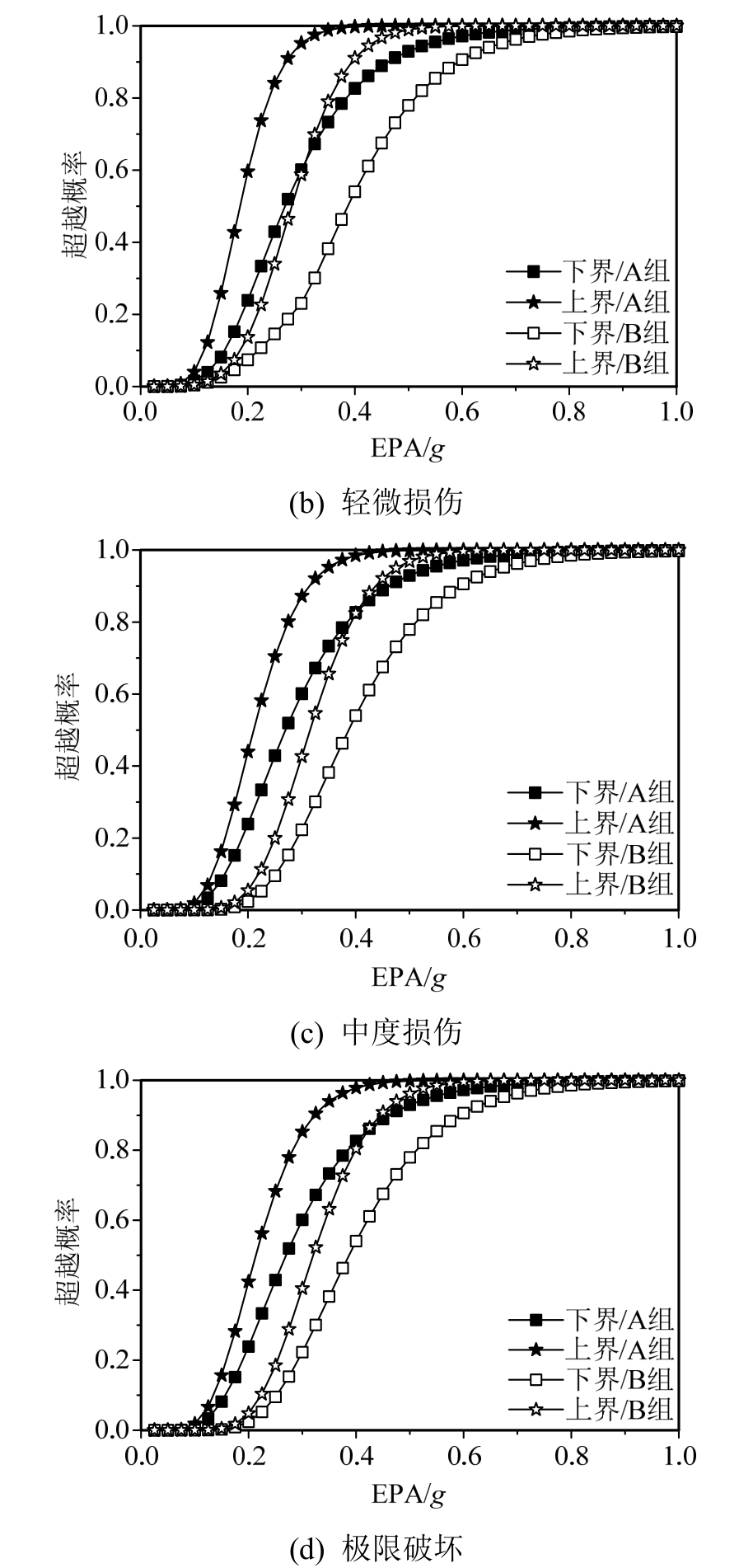 图4给出了横向地震动输入下的桥墩和支座的易损性曲线。可以看出,与同样峰值的B组远场地震动相比,含速度脉冲的A组近断层地震动作用下,桥墩和支座发生各级损伤的超越概率更大,均增大约30%~50%;桥台支座发生损伤的超越概率最大,在EPA为0.3g的近断层地震动作用下就会发生横桥向剪切完全失效。