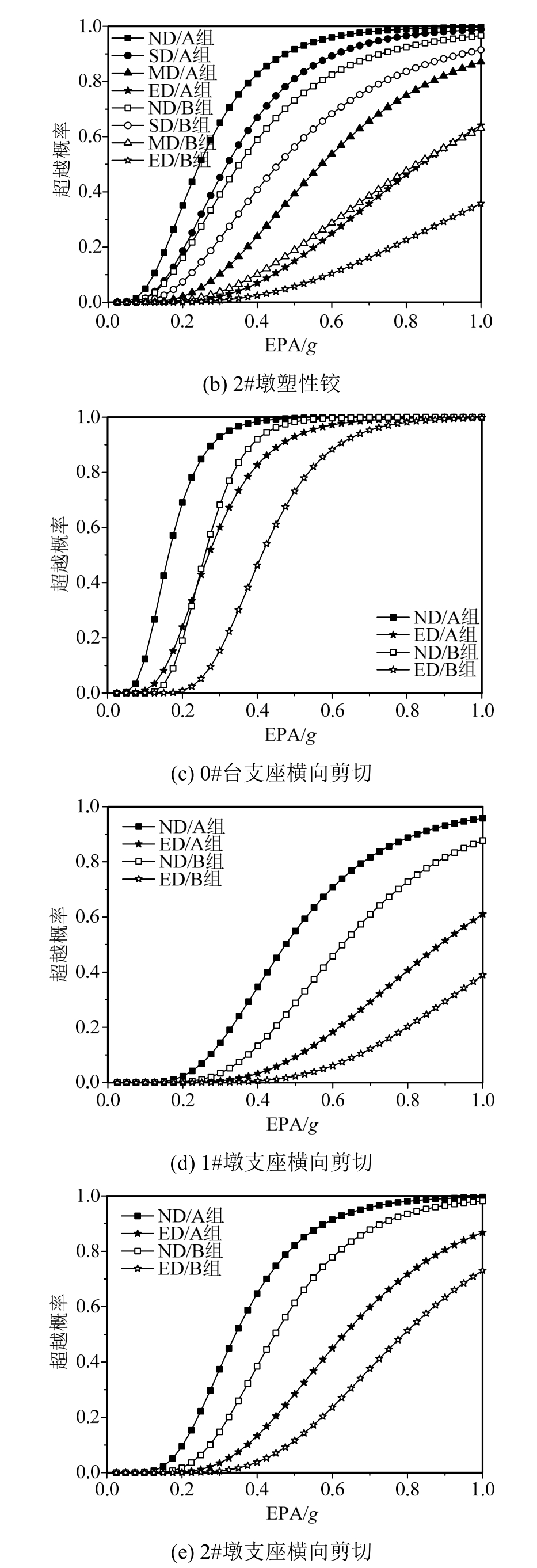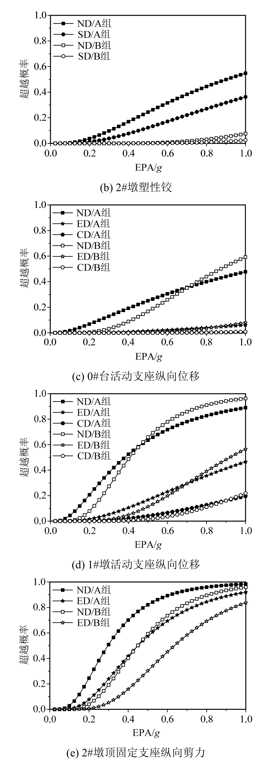 图7给出了纵向地震输入下此高架桥各组成构件易损性曲线。由图7可以看出,高架连续梁桥在保证桥台不出现破坏的前提下,梁-台的碰撞效应会限制桥墩的塑性铰发展,梁-台之间的伸缩缝间隙实际就等于2#固定墩墩顶最大纵向位移(即±8 cm),即使 A组含速度脉冲的近断层地震动也只会使桥墩发生轻微损伤(图7(a)~图7(b));此外活动支座的纵向位移响应也会受到梁-台碰撞限制,小于支座的设计纵向活动量(即±15 cm),也根本不会发生纵桥向落梁现象(图7(c)~图7(d));但是,梁-台较大的碰撞力却会导致 2#墩顶固定支座的纵向剪切极限破坏(图 7(e)),主梁与桥墩失去唯一的纵向约束,主梁形成机动体系。