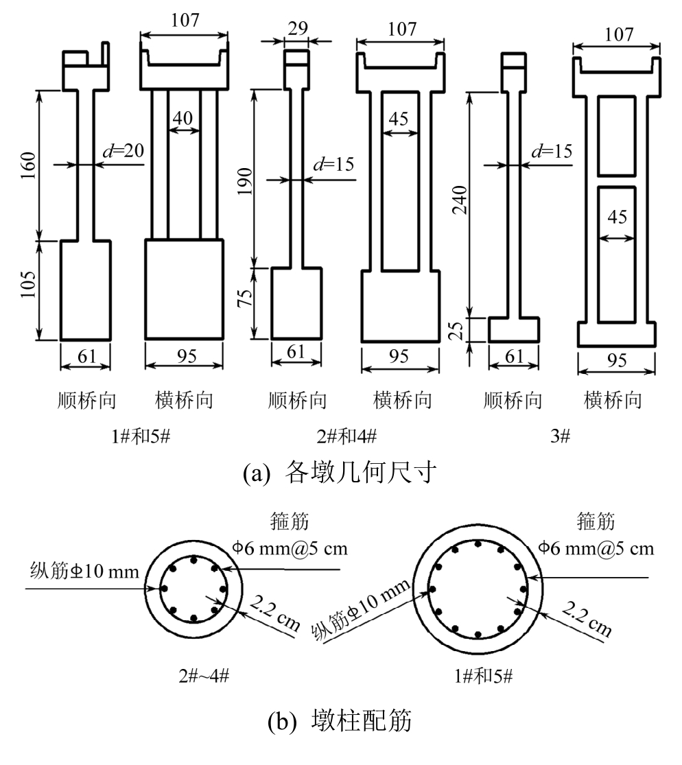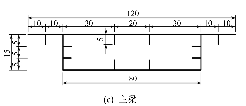 其中下部结构墩柱设计如图9(a)~图9(b)所示,中墩均按照原型进行等比例缩尺制作,而桥台根据剪切刚度相似的原则采用结构简单的双柱墩去等效代替。由于原桥主梁为预应力结构,且缩尺之后顶底板及腹板较薄,不易制作,加之主梁在地震中一般不会发生非线性破坏,所以根据刚度相似原则采用钢箱梁代替,如图9(c)所示。在3#墩顶设置固定支座,在其它桥墩均设置单向活动支座,支座高度均为7.5 cm,支座摩擦系数测试为0.1~0.2。