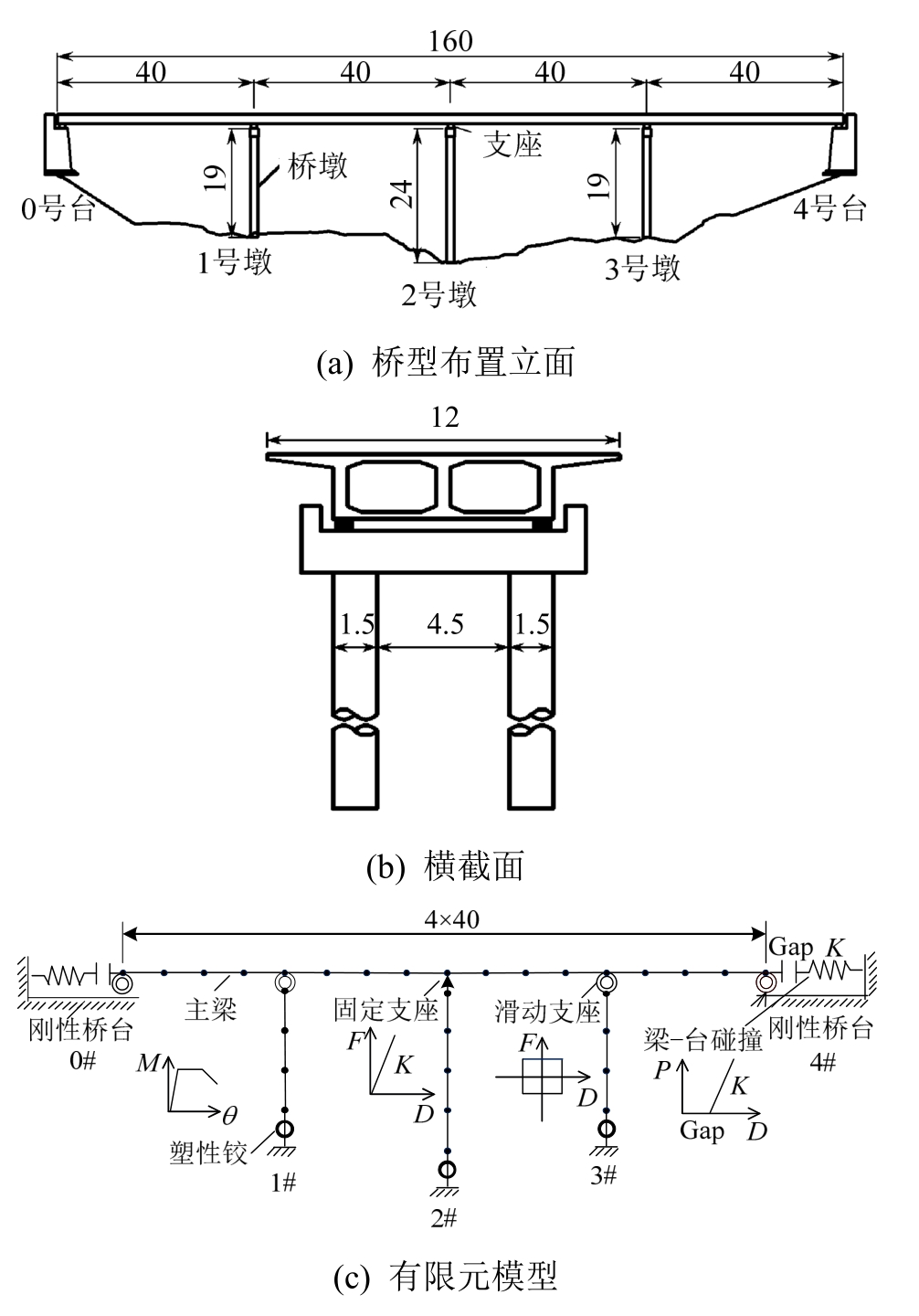 某四跨高架连续梁桥如图1所示,中间为3个双柱式桥墩,直径 1.4 m,两端为刚性桥台,梁端与桥台之间的伸缩缝间隙为0.08 m,上部结构采用单箱双室预应力混凝土箱梁,桥宽12 m。其中2号墩和主梁之间设置固定支座,其它墩台和主梁之间设置单向活动支座。
