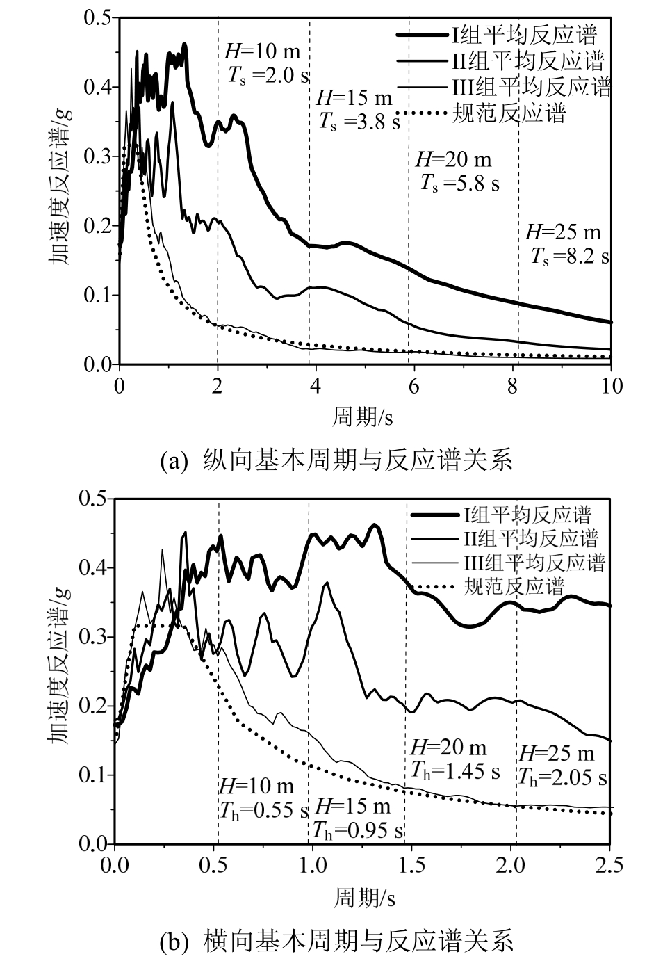 由图2可以看出,III组地震动的平均反应谱值与规范反应谱值基本一致,但小于II组和I组的近断层地震动的平均反应谱值;桥梁的纵、横向一阶振动周期Ts和Th随墩高增加而增大,对应的各组地震动的反应谱值以I组最大,II组次之,III组最小。对于目前桥梁抗震采用的设计远场反应谱而言,一阶周期对应的谱值很小,而对于近断层地震记录的反应谱而言,则对应的谱值较大,即常规高架连续梁桥在近断层地震动作用下会超过设计的地震响应。