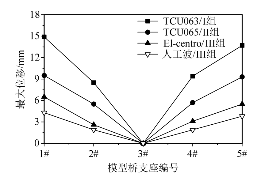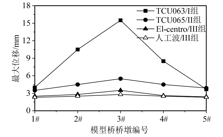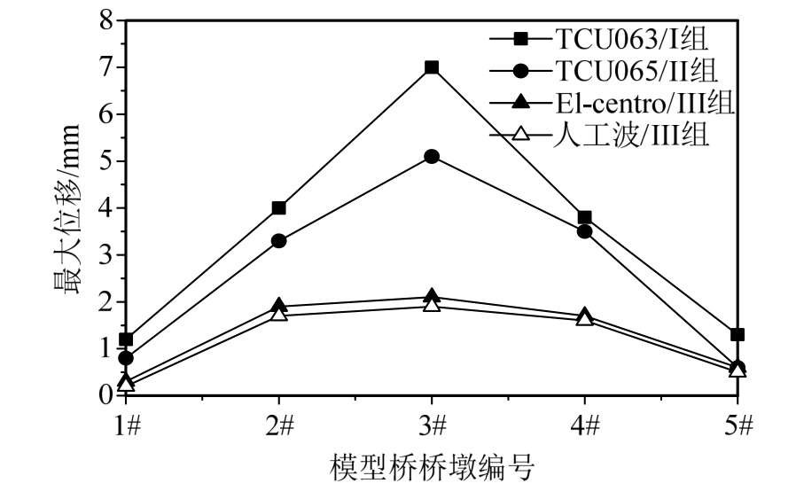 分别选取表1中的I组TCU063、II组TCU065、III组El-Centro和人工波作为输入波,调整各地震波EPA至0.4g进行振动台试验。图10给出了横向地震动输入下的桥墩墩顶相对位移响应实测结果对比,可以看出,具有速度脉冲的近断层地震动 I组TCU063输入下的主墩墩顶位移响应最大,II组TCU065次之,III组El-centro和人工波输入下的位移响应最小;由于 1#和5#桥墩较刚,所以墩顶位移响应最小且相差不大。