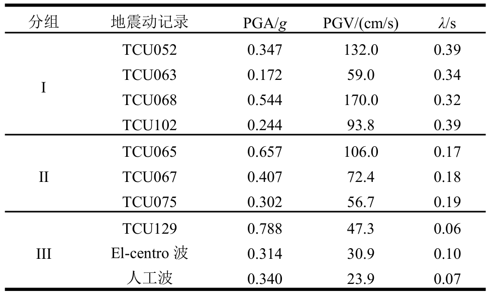 表1给出了部分近断层和远场地震动记录,根据比值λ=PGV/PGA 的进行分组,其中 I、II、III组的比值分别为λⅠ>0.2 s、λⅡ≈0.2 s和λⅢ<0.2 s,而且Ⅰ组地震动存在速度脉冲效应[14]。通过调整三组地震动记录的有效加速度峰值(EPA)至相同值,并与规范设计加速度反应谱进行对比,如图2所示。