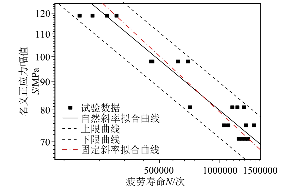 侧面角焊缝试样的破坏模式为焊缝起点向热影响区延伸的裂纹,故考虑以盖板处的名义正应力幅值作为评价指标重新绘制侧面角焊缝拟合结果,作为对比和参考。此时拟合得到的结果标准差与相关系数和用名义剪切应力幅值得到的曲线一致,但是在固定拟合时,对于盖板名义正应力幅值评价的构造细节,m的值取为3。如图9所示。