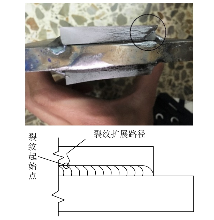 对于侧面角焊缝搭接接头,全部试样的裂纹位置出现在角焊缝起点处向盖板母材热影响区延伸的区域,在静力拉伸阶段出现自角焊缝起点向盖板母材延伸的倾斜裂缝,与疲劳加载结束时观察到的裂纹方向一致。如图5所示。