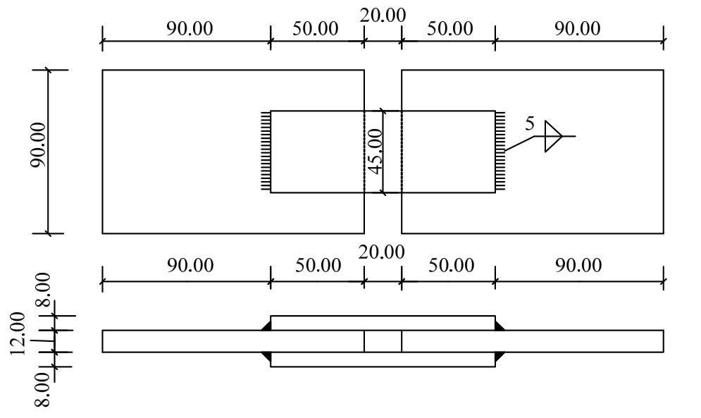 侧面角焊缝的搭接接头细节的试件尺寸如图 2及图3所示,盖板选用8 mm薄钢板,被连接件选用12 mm薄板。焊脚尺寸为5 mm。试验材料为Q345B钢材。钢材质量保证书提供的化学成分如表1所示。力学性能由厂商完成的材料性能试验提供,如表2所示。