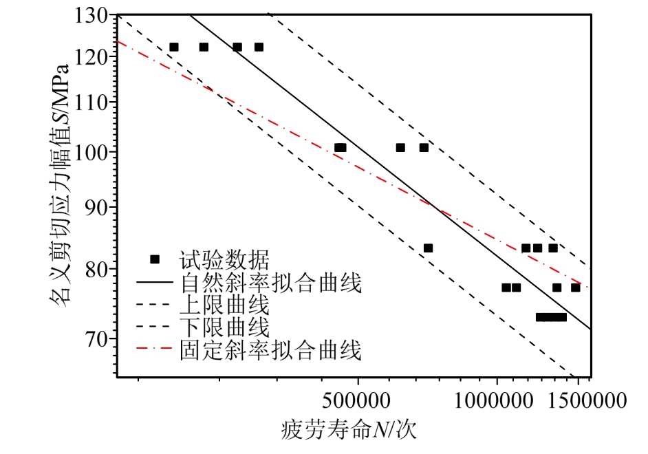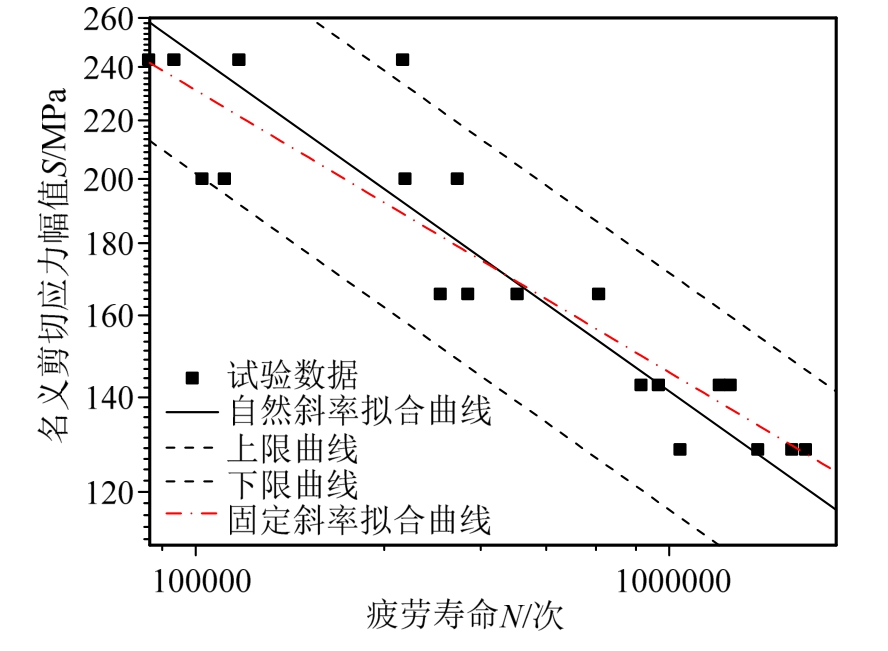 4) 用5个应力幅值水平记录下来的20个数据点的名义剪切应力幅值-疲劳破坏次数关系拟合出2类构造细节的疲劳S-N曲线,即名义应力-寿命曲线,并与各国现行规范比较。