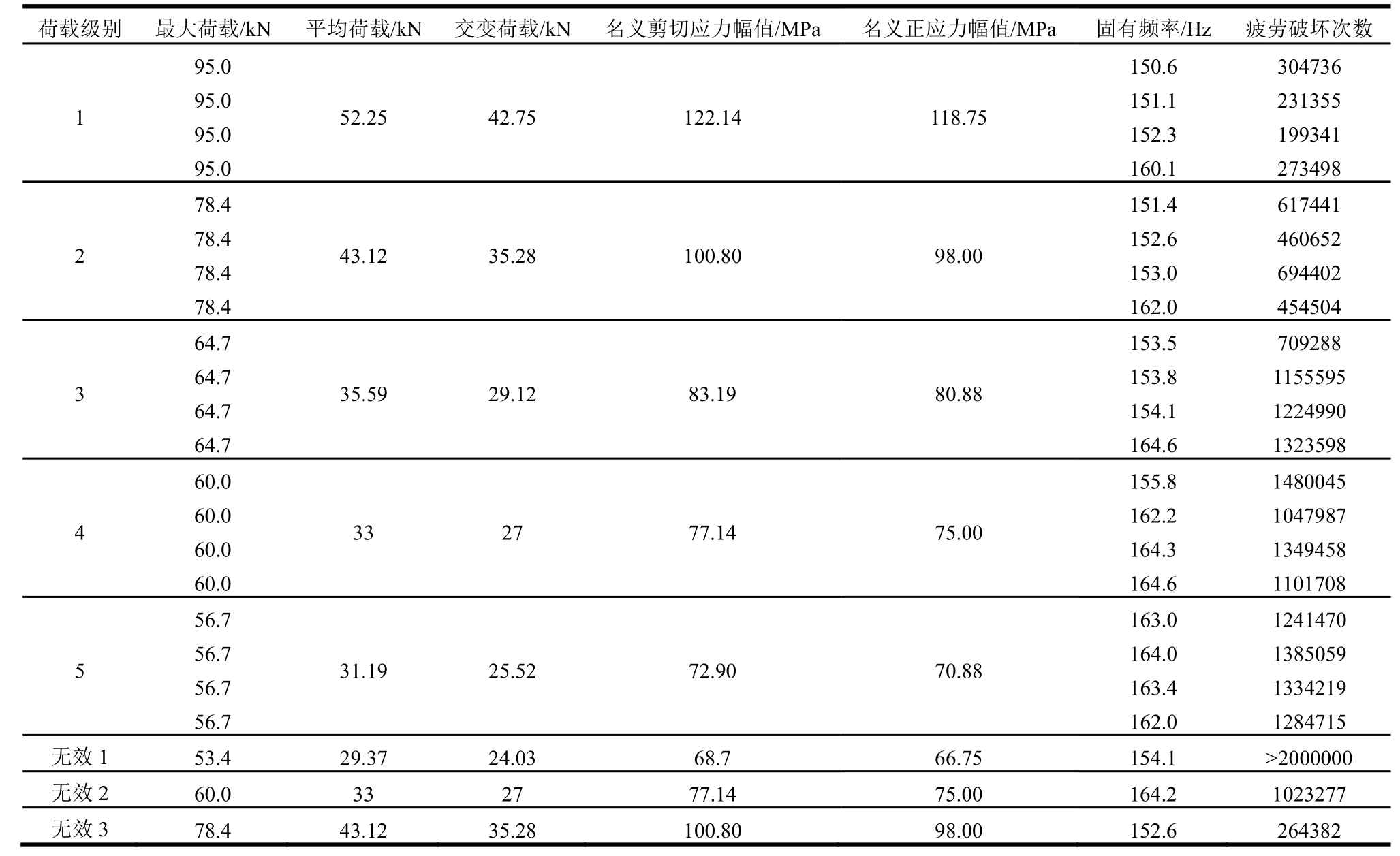 1) 疲劳试验中交变荷载的频率为与试件固有频率发生共振时的频率,频率范围为150 Hz ~164 Hz。