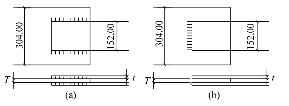 为了使疲劳试件较好地反映角焊缝搭接接头在焊缝受剪切的应力状态下的抗疲劳性能,使得细节处的名义应力幅值达到0.7倍~0.8倍的静力屈服强度和中国规范200万次循环疲劳强度参考值之间,荷载范围在疲劳试验机动载范围内,另外同时考虑力学试验室疲劳试验机夹持端的尺寸范围,参照金属轴向疲劳试验方法GB/T 3075—2008[14],模拟了2类搭接接头疲劳细节。由于实际的盖板搭接接头盖板与端板仅以焊缝连接,因此制作试件时分别切割盖板和端板,最终焊接成型。