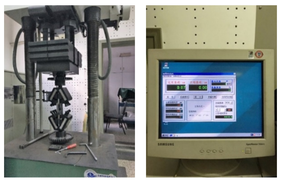 整个试验系统由试验主机、控制装置、控制计算机组成。试验主机和控制计算机如图4所示,试验主机主要进行试件的夹持、安装、试验;控制装置用于调节试验机以及指示试验机是否正常运行;控制计算机通过输入交变荷载和平均荷载,来控制整个疲劳试验的加载范围,可以通过输入给定循环次数和频率降低范围来控制试验机停机,读取试样的谐振频率和疲劳循环次数。
