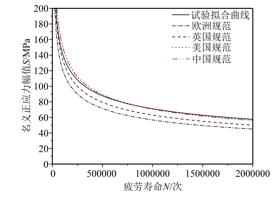 对比可发现,名义正应力幅值S-N曲线的试验拟合结果与中国规范GB 50017—2017和美国规范给出的结果都较为吻合。而欧洲规范和英国规范则偏于保守。