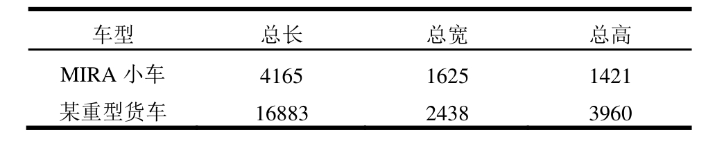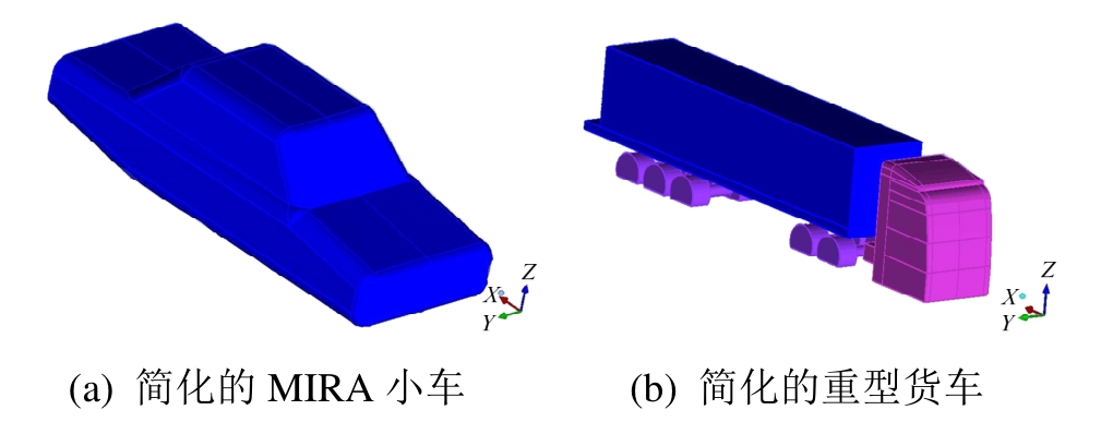 本文将某大跨度桥梁主梁断面进行相应的简化,忽略检修道和人行栏杆等细部结构,如图1所示。分别选取大型和小型典型车型的MIRA阶背式小车和某重型半挂式箱型货车为研究对象,简化车辆细部结构,去除后视镜、车辆轮胎(对于 MIRA小车去除全部轮胎,重型货车去除1/3个轮胎)、门把手、车前灯、后尾灯等,如图2所示,两种车型的主要尺寸如表1所示。