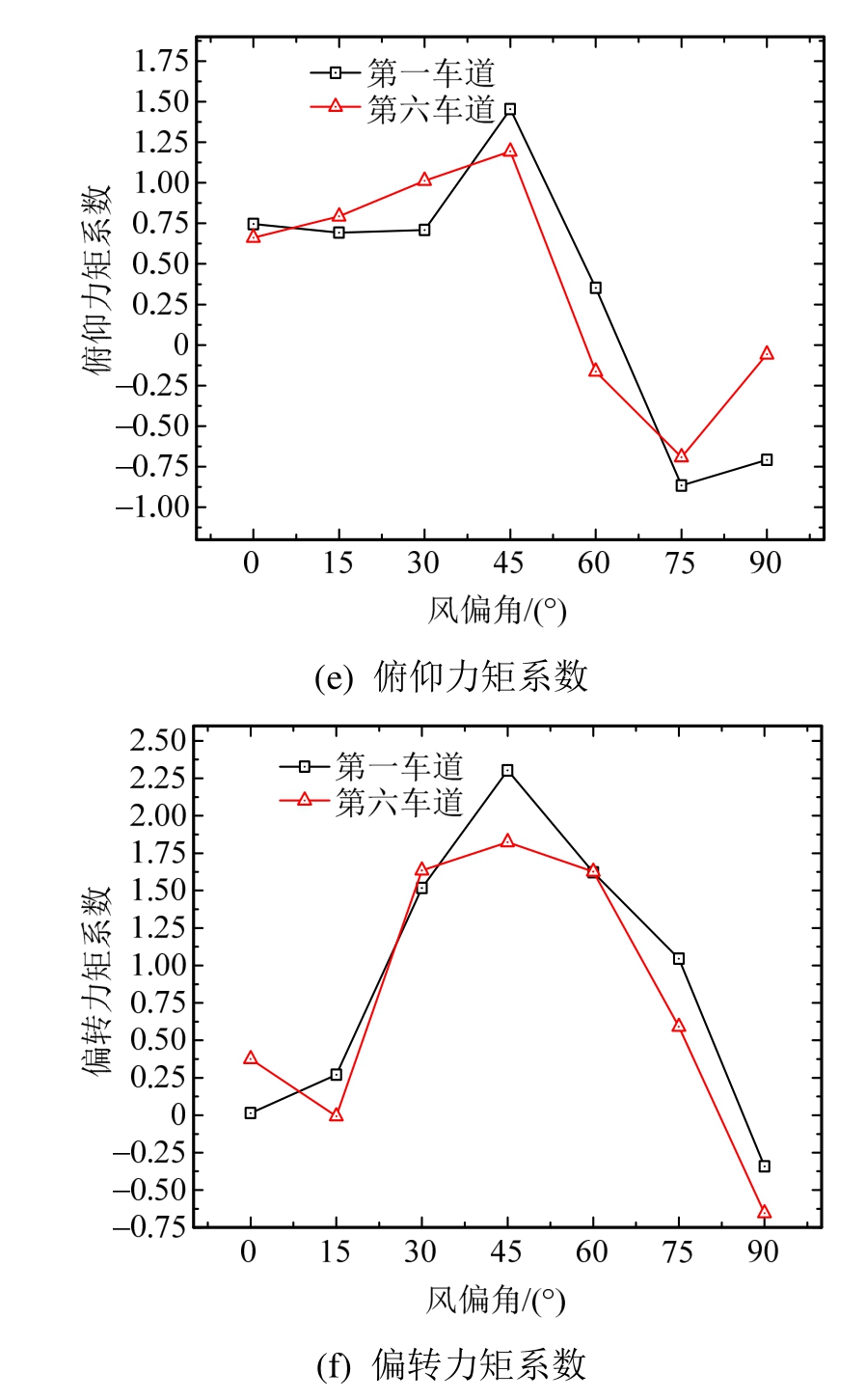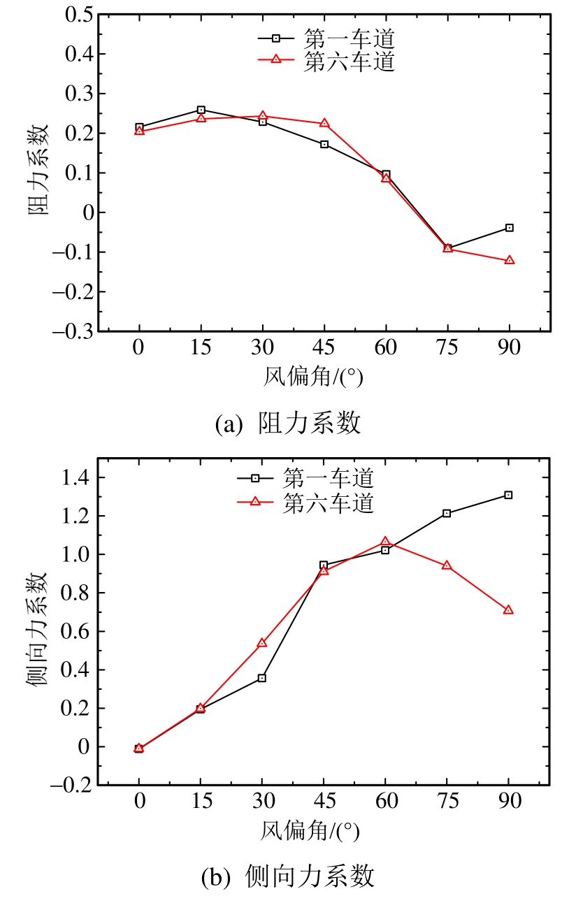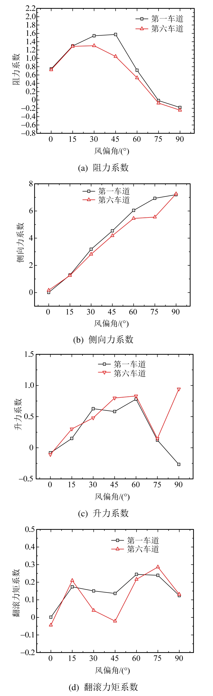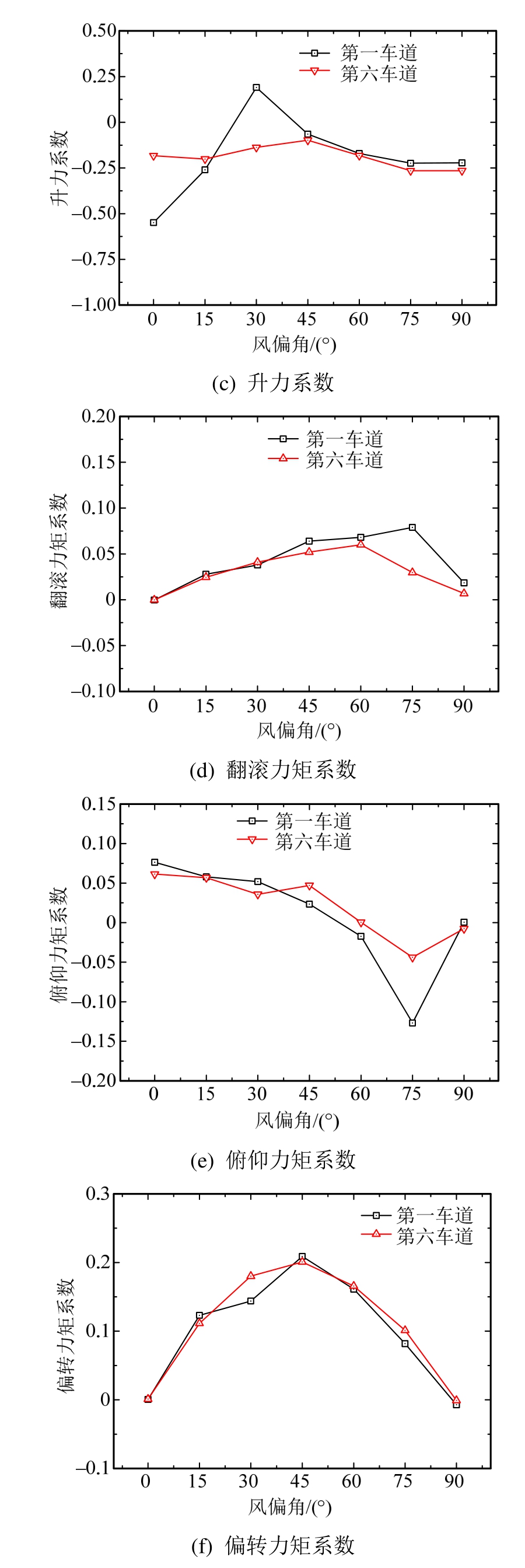 由图9可知,车道位置对重型卡车的气动力系数影响较大。对于阻力系数,车辆位于第一、第六车道时,其变化趋势完全一致,但风偏角在[15°,60°]范围内时,位于第六车道的气动力系数显著小于第一车道的气动力系数,说明车道位置对气动力影响较大;对于侧向力系数,在 75°风偏角时车道位置对于气动力影响较大;对于升力系数,在 90°风偏角时,车辆位于第六车道时,升力系数发生了较大的突变,可能是由气流绕过重型卡车产生的涡旋与桥梁尾流产生的涡旋相互作用引起的,其他风偏角则影响不大;对于翻滚力矩系数,在 45°风偏角时第六车道明显小于第一车道,说明影响较大;对于俯仰力矩系数和偏转力矩系数,虽然车辆位于第六车道时力矩系数的变化趋势与第一车道时的基本一致,但是对于一些风偏角力矩系数的值还是有较大变化的。