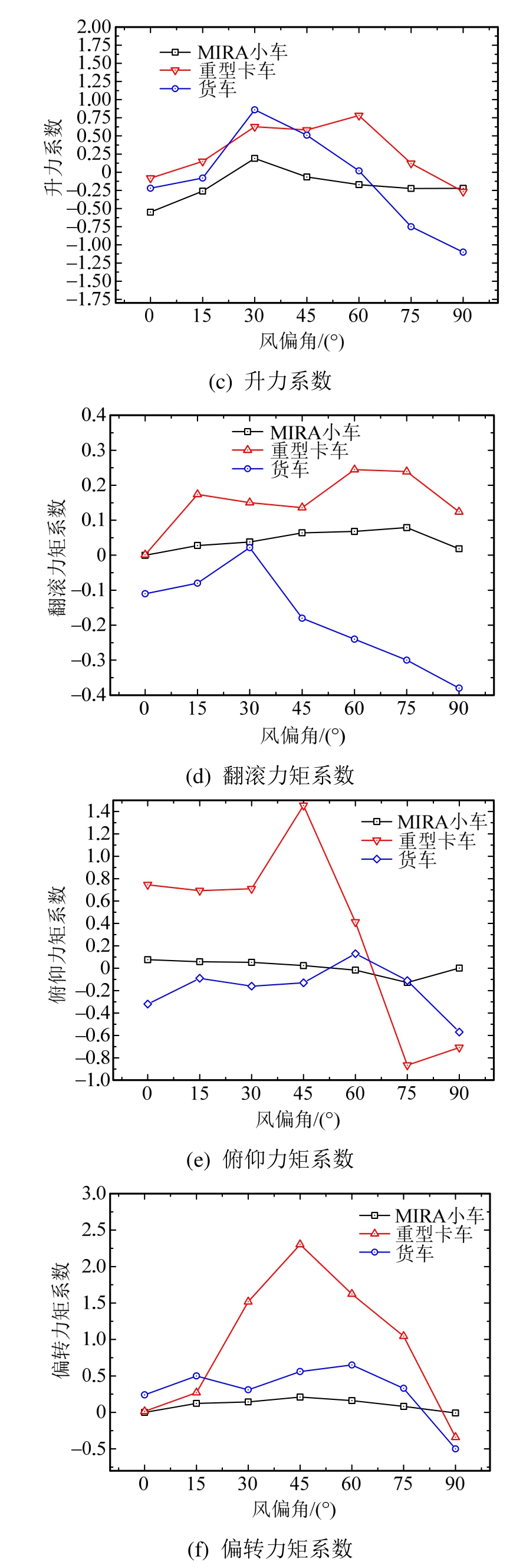 由图7(a)可知,重型卡车阻力系数最大,货车的次之,MIRA小车最小。三种车型的阻力系数均随风偏角的增大而先增大后逐渐减小,但受三种车型的气动外形的影响,其最大值、最小值出现的风偏角均不同。由图7(b)可知,三种车型的侧向力系数均随着风偏角的增大而增大,均在风速以垂直方向吹向侧面时达到最大,主要是由于此时对于三种车型挡风面积均达到最大;并且由于重型卡车的侧向挡风面积最大,故其侧向力系数最大,货车次之,MIRA小车最小。由图7(c)可知,三种车型的升力系数均随着风偏角的增大先增大后减小,相对于其他气动力系数,车型对升力系数的影响较小。由图7(d)可知,MIRA小车的翻滚力矩系数变化平缓,而且数值非常小,而货车翻滚力矩系数的数值较重型卡车大,说明在横向风作用下货车最易发生侧翻,行车安全性最差。由图7(e)可知,MIRA小车和货车的俯仰力矩系相对较小,而重型卡车的俯仰力矩系数较大,这主要是由于重型卡车的长度较长。同样地,对于偏转力矩系数,也是重型卡车的系数较大,而其他两种车型系数较小。通过上述分析,MIRA小车、重型卡车和货车的气动力走势基本一致,但由于气动外形的差异,气动力变化规律略有差异。