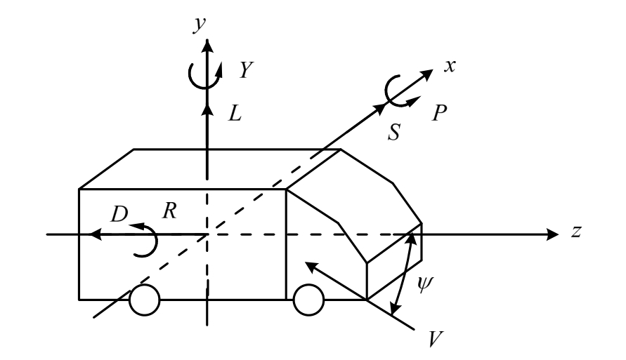 式中:CD、CS、CL、CR、CP、CY分别为风偏角为Ψ时车辆的阻力系数、侧向力系数、升力系数和车辆的翻滚力矩系数、俯仰力矩系数、偏转力矩系数;FD、FS、FL、MR、MP和MY分别为作用于车辆形心点的阻力、侧力、升力、翻滚力矩、俯仰力矩和偏转力矩,其示意图如图6所示;A为车辆的行驶方向迎风面积;hv为车辆形心到桥面距离;V为来流的合成风速,合成风速是由车辆运动速度和入口风速矢量合成的,风偏角为合成风速与车轴线的夹角,如果车辆静止在桥上,这时风洞的来流风速即合成风速,而来流风速与车轴线的夹角即为风偏角。风偏角以车辆迎风面为0°,以垂直于车身的横风为90°。