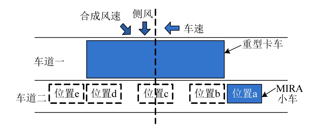 车辆静止时各个工况模拟条件如表2所示。其中工况1仅用于数值模拟结果验证。工况6重型卡车遮挡MIRA小车相对位置有:a) MIRA小车车头平齐卡车车尾;b) MIRA小车车尾平齐卡车车尾;c) MIRA小车位于卡车中心处;d) MIRA小车车头平齐卡车车头;e) MIRA小车车尾平齐卡车车头,如图5所示。