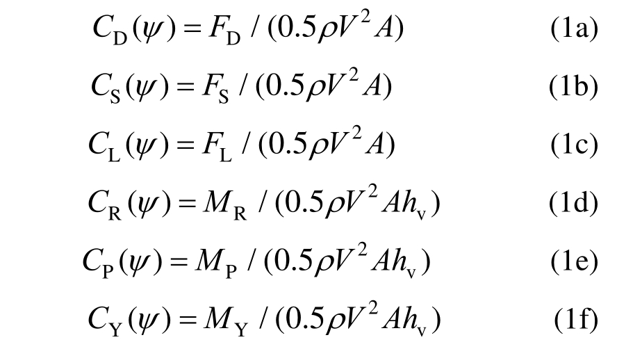 对于车辆,本文将研究其六个气动力系数。计算车辆气动力参数时,参考面积采用车辆正面投影面积,参考高度取车体形心到路面或者桥面的距离,则车辆气动参数定义为: