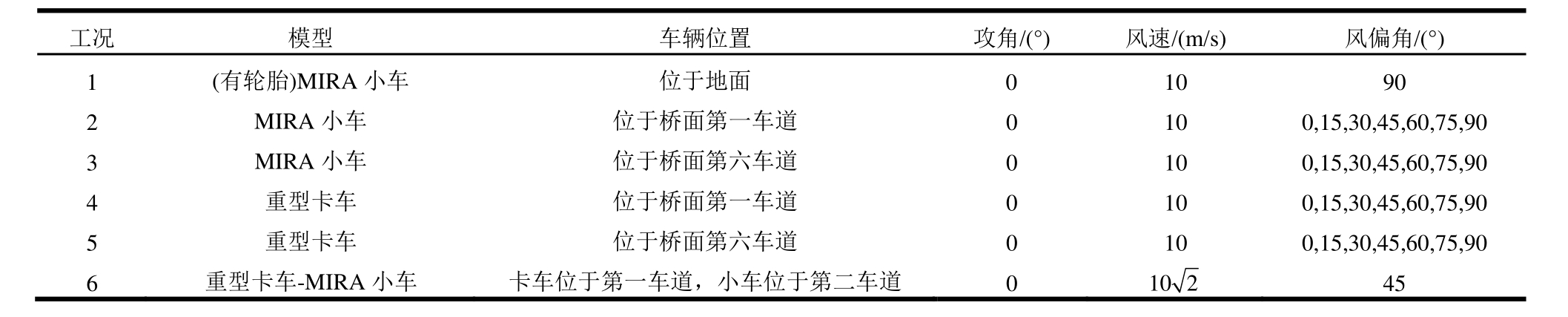基于上述研究现状,本文开展了侧风作用下MIRA (Motor Industry Research Association)阶背式小车(世界著名的经典汽车模型)和某重型半挂式箱型货车分别位于桥面不同车道位置时车辆气动特性变化情况的研究;并进一步研究了横风作用下桥面上重型卡车与MIRA小车之间的挡风效应随着车辆相对位置的变化情况。