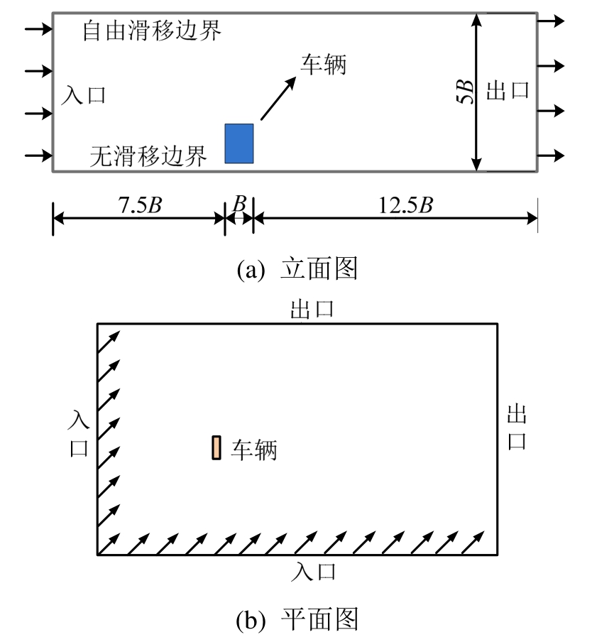 入口采用速度入口边界,当没有风偏角时,只有法向速度即切向速度为零,当有风偏角时,采用卡迪尔分量来表示合成速度,如图3(b)和图4(b)。出口采用压力出口边界,相对压力取值为零。当风偏角为90°时,前后壁面采用对称边界,当有风偏角为其他角度时,前壁面采用速度入口边界,后壁面采用压力出口边界。图3(a)中顶面和底面采用自由滑移壁面,桥梁表面采用无滑移壁面,图4(a)中底面采用无滑移边界,车辆表面采用无滑移壁面。