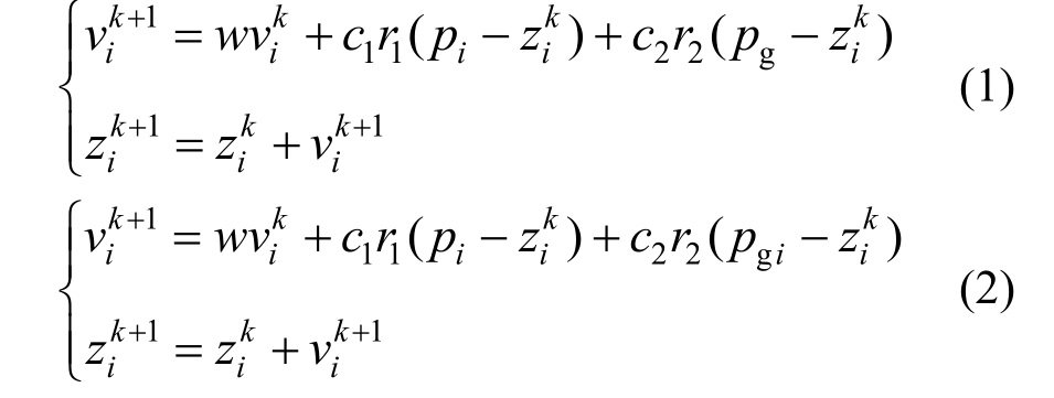 式中:vik和zik分别表示第k次迭代时第i个粒子的速度和位置;pi和pgi分别表示第k次迭代时第i个粒子的最优位置和所在子种群的最优位置;pg表示所有种群的最优位置;k表示当前迭代次数;w为惯性权重因子;c1、c2为学习因子;r1、r2为[0,1]之间的两个随机数。