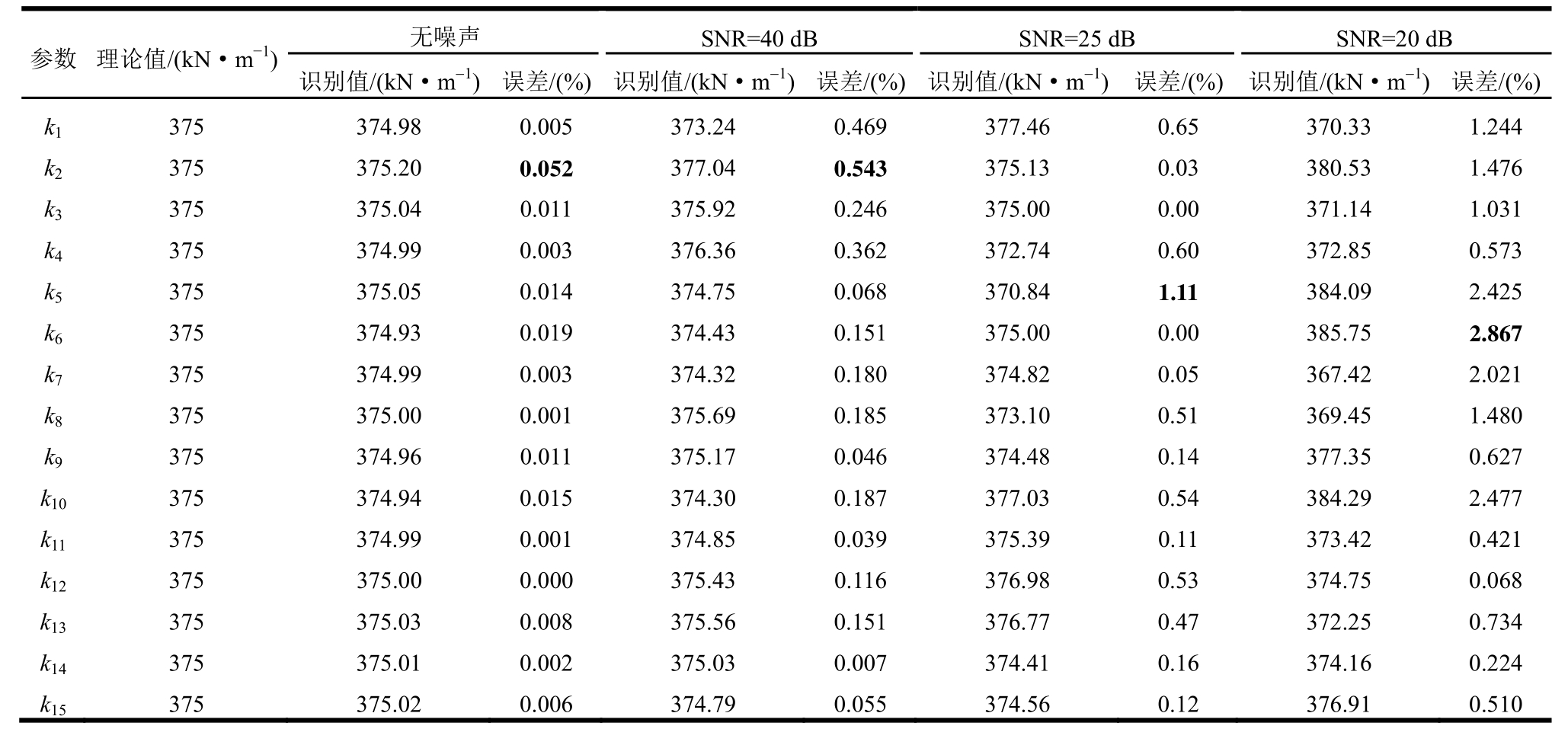 从表2可以看出结构在健康状态下,随着环境噪声从40 dB增大到25 dB、20 dB,最大识别误差从0.543%增大到0.65%、2.867%,识别值仍与理论值吻合良好;结构损伤状态也存在同样的规律。从表3可以看出结构在第7层发生10%刚度退化时,该算法能准确找到损伤位置(第7层),且识别该层刚度的精度非常高,在20 dB强噪声下的识别误差仅1.158%。可见,本文所提出的方法具有很高的辨识精度和较强的抗噪能力。