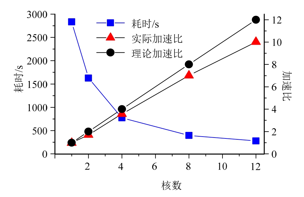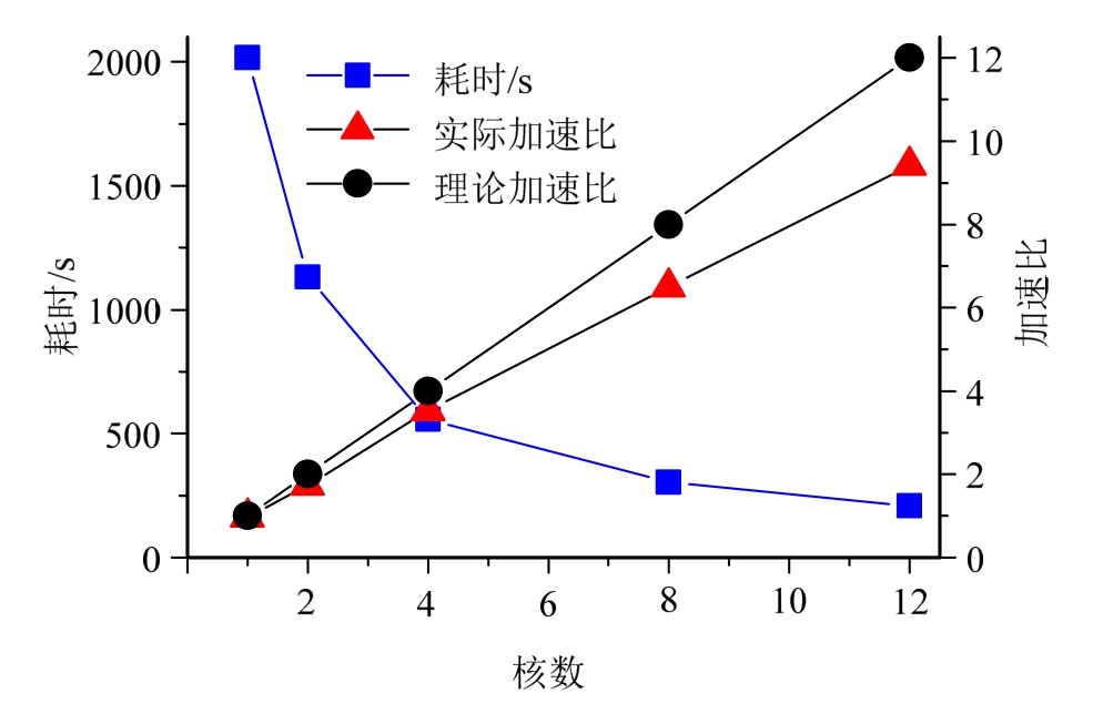由表8可得,在大量计算片段下,多核分布式并行的加速比虽随着计算片段的增多,加速比稍有下降,但下降幅度不大,其加速效果依然显著。在12核分布式并行环境下,当计算片段增加到800倍时,仍能保持7.80倍的加速效果。