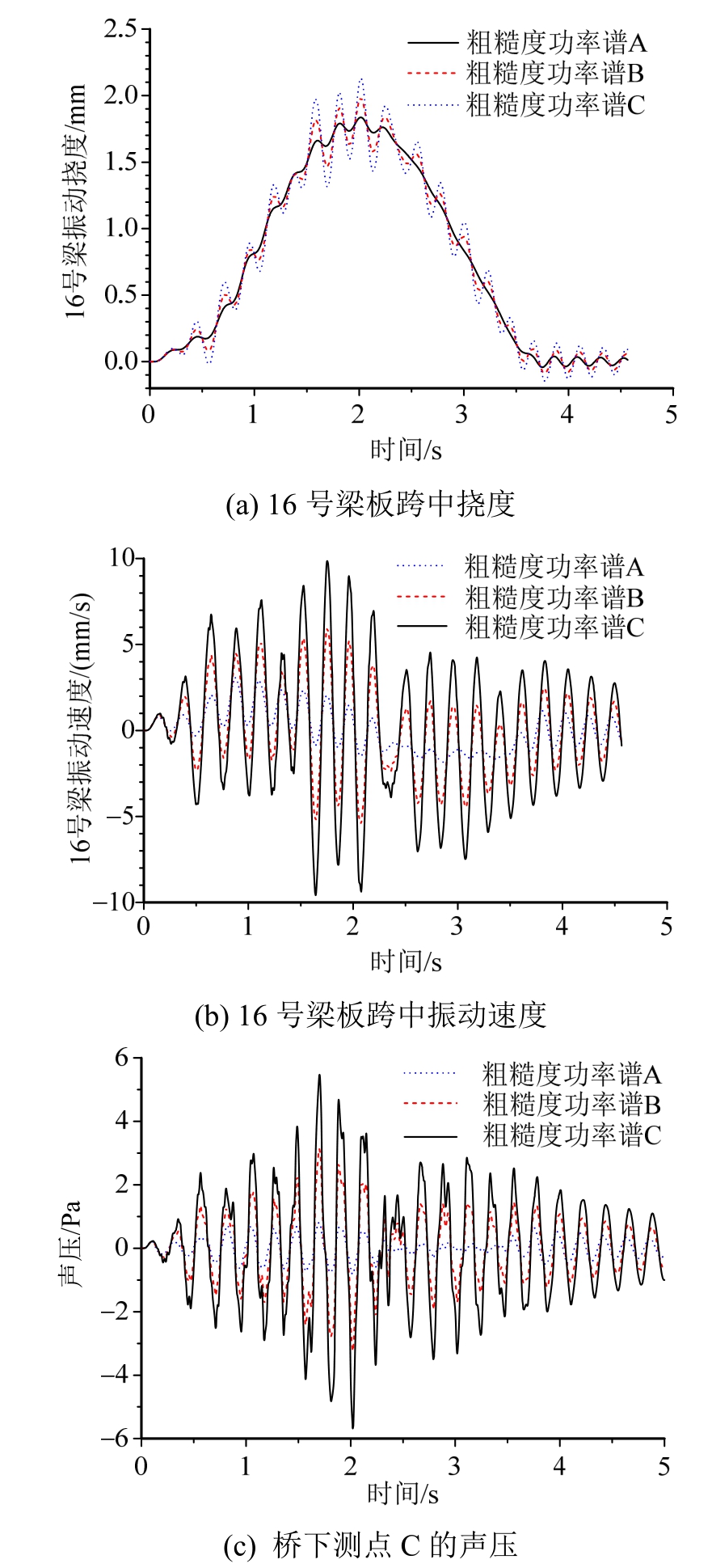 图 15表明,桥面粗糙度越大,车辆经过时桥梁挠度和速度波动越大,声压也越高。因此,减小桥面粗糙度是降低铰接板桥结构噪声的有效途径。