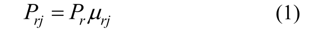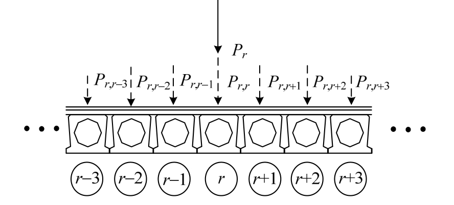 桥梁模型需能反映铰缝的横向连接作用,以前往往对梁板建立实体、板壳或梁格有限元模型,用横向连接单元模拟梁板间的铰缝连接,该方法必须划分非常密集的网格,否则会导致振动位移计算结果的锯齿状失真。本文则提出了另一种建模方法,将荷载横向分布影响线[13]引入到车桥耦合振动的有限元分析中,对各梁板建立独立的单梁有限元模型,单元类型为欧拉弯曲梁单元[16],如图1所示。动态的车轮荷载按照横向分布影响线分布到各块梁板,然后分析各梁板的振动响应。如图2所示,作用在r号梁板上的力rP造成的j号梁板荷载为: