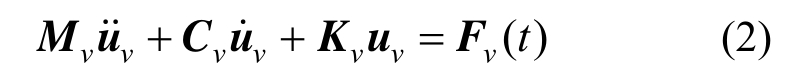 其中:Mv、Cv、Kv分别为质量矩阵、阻尼矩阵和刚度矩阵;uv是车辆节点位移,其中节点1、2、9、10、15、16的位移等于轮桥接触点处桥梁的振动位移与桥面粗糙度之和;