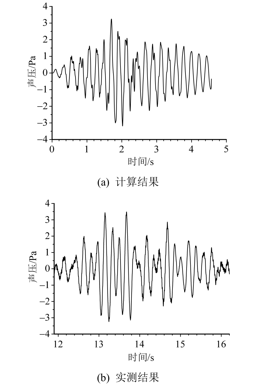 将3.1节振动分析得到的动挠度作为输入量代入声学边界元计算中,可以获得桥梁周边任一点的声压,以图5中的声压测点C为例,载重车经过铰接板桥时的声压时程如图 12所示,边界元计算结果与实测基本一致。