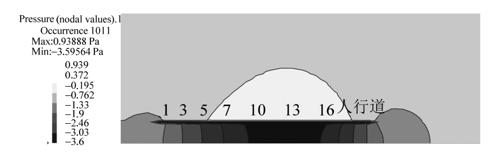 图 16表明,桥梁横向联系越好,横向各梁板间振动的差别越小,桥下各处的声压差别也越小。图17为横向联系极好时的桥梁周边声场,与图14中实桥声场比较,图17中的最大声压较小(3.02 Pa),桥下各处的声压差别也较小。这说明增强各梁板之间的横向联系,可以减小桥梁结构的声辐射。反之,当桥梁横向联系比较弱时,或者横向联系受损时,桥下的最大声压会增大,桥下横向的声压差异也会增大。