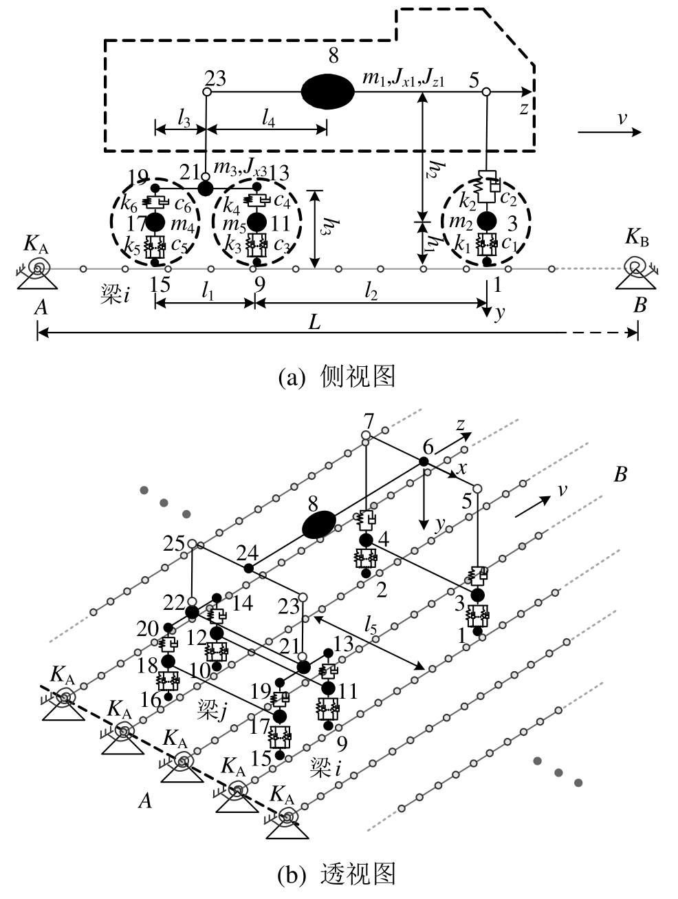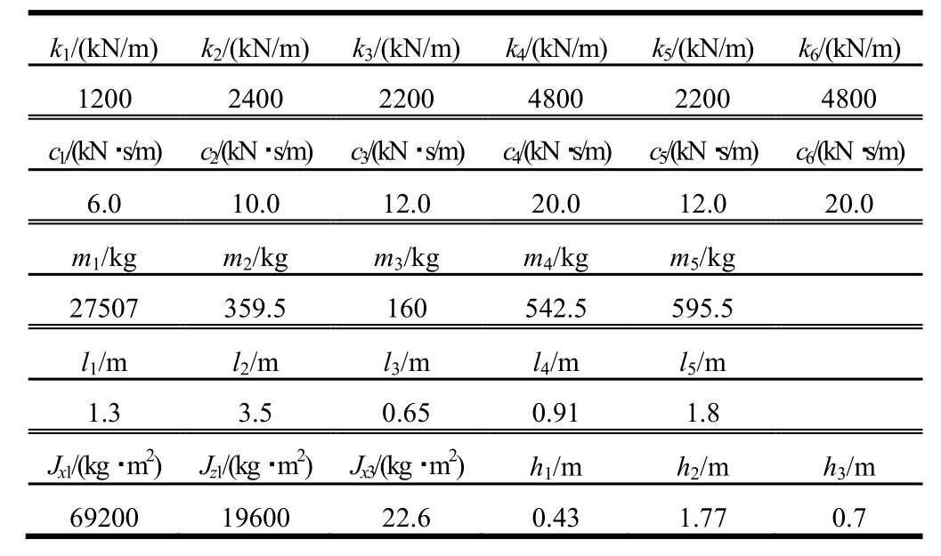 车辆模型为典型的三轴载重汽车[15],该模型由37个单元组成,其中与桥面接触的6个单元代表轮胎,采用分布式弹簧—阻尼(DSD)单元,可以模拟车辆通过伸缩缝时的跳车情况,其余分别为普通弹簧-阻尼单元(6个)、集中质量单元(9个)、刚性梁单元(16个),计算参数见表1。