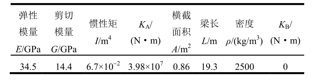 实验车辆的参数见表1。桥梁由18块1 m宽的预制空心梁板组成,每块梁板的参数如表2所示。在该连续桥面简支梁中,桥面板与主梁端部之间设置了20 cm的脱粘段,桥面连续段长度为44 cm,从而降低了简支梁之间的连接刚度[17],由此算得第四跨端部的边界弹簧刚度KA、KB(图1(b))见表2,其中B端有伸缩缝,所以KB为零。桥的阻尼采用瑞雷阻尼,第1阶、2阶振型对应的阻尼比取0.02[18]。