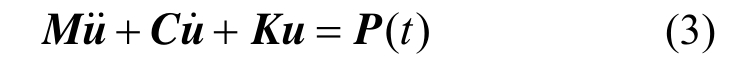 其中:u为桥梁节点位移;M、C、K分别为质量矩阵、阻尼矩阵和刚度矩阵。结构阻尼采用瑞雷阻尼[18];P(t)为所有车轮荷载组成的矢量,单个车轮荷载即为式(1)中的Pr,由下式计算[15]: