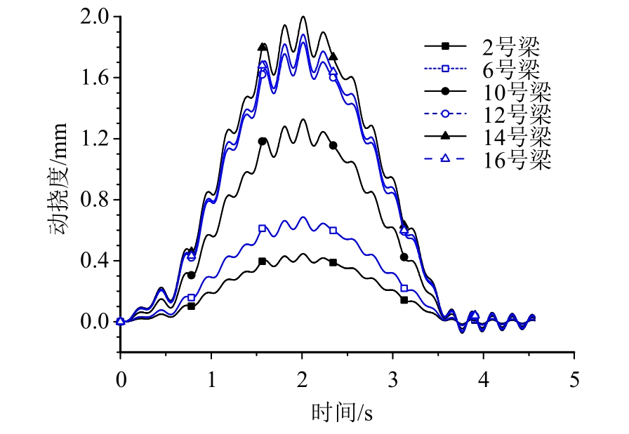 考虑车轮轮底与12号、14号梁板对应位置的位移协调条件,并取图4中的B类桥面粗糙度,通过迭代求得车轮动荷载,进一步确定各梁板分担的荷载,以及由此产生的动挠度。图7为汽车中轮运动到第四跨跨中时的动挠度分布。图8为跨中动挠度的计算时程,图9为实测动挠度,两者形态相似,最大计算挠度比实测挠度大15%,表明本文算法可以比较准确的反映铰接板桥的动挠度。产生误差的原因在于:① 计算模型的刚度略小于实际结构的刚度;② 机电百分表跟随桥梁变形的性能不佳,在峰值挠度测试时存在滑脱现象。