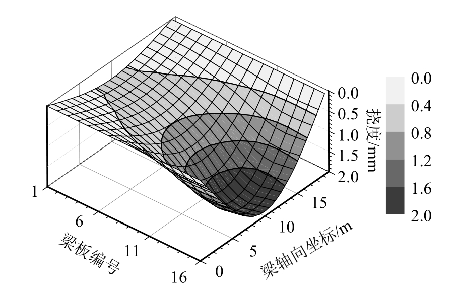 横向联系是铰接板桥的薄弱部位,也是衡量铰接板桥性能的重要指标。横向联系越强,车轮荷载由各块梁板分担得越均匀,反之,车轮荷载仅由车轮附近的梁板承担。以下考虑两种横向联系情况,第一种是图6所示的实际荷载横向分布影响线,第二种是极好的横向联系情况,即假设荷载均匀分布在各块梁板上,此时荷载的横向分布影响线竖标相同。计算得到这两种情况下各梁板的挠度、速度和2号、14号梁板下(测点C)的声压,如图16所示。