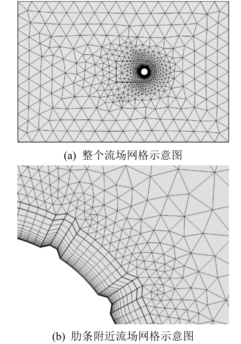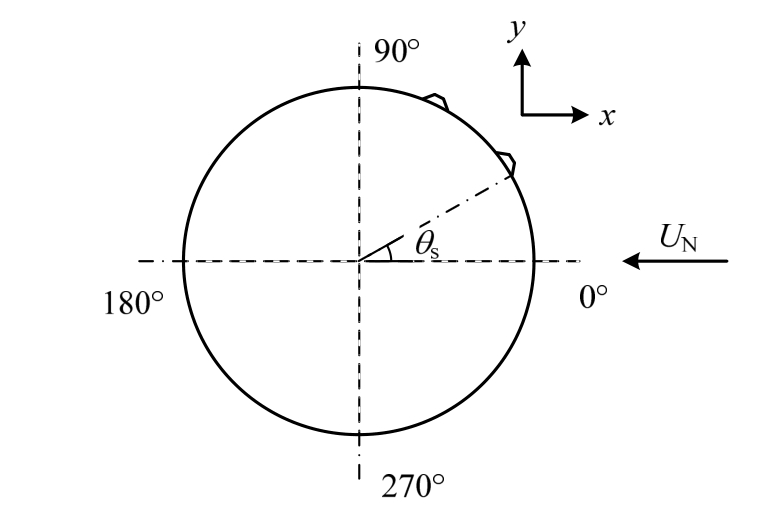 图4显示了斜拉索的横截面示意图,在迎风向的斜拉索表面有两个梯形肋条,由于上水线的形成和沿斜拉索发生周期性振荡可能是斜拉索出现风雨激振现象的重要原因,已有试验数据[23]表明上水线的振荡范围θ≈30°~75°,两个纵向肋条分别放置在