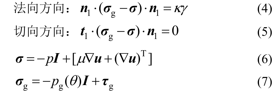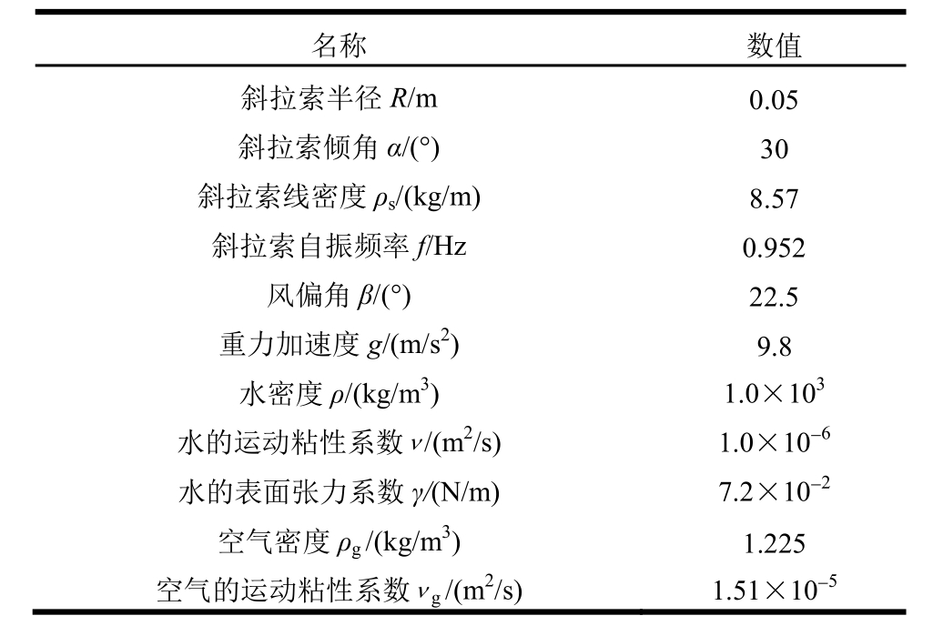 其中:σ和σg分别为水膜与空气交界处水膜和空气的应力张量;γ为水在空气中的表面张力系数(γ与θ无关);I为单位向量;pg为水膜表面所受的空气压力;τg为空气的粘滞力张量;h为斜拉索表面水膜的厚度;κ为水膜表面的曲率: