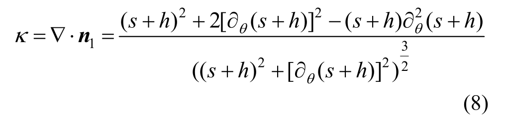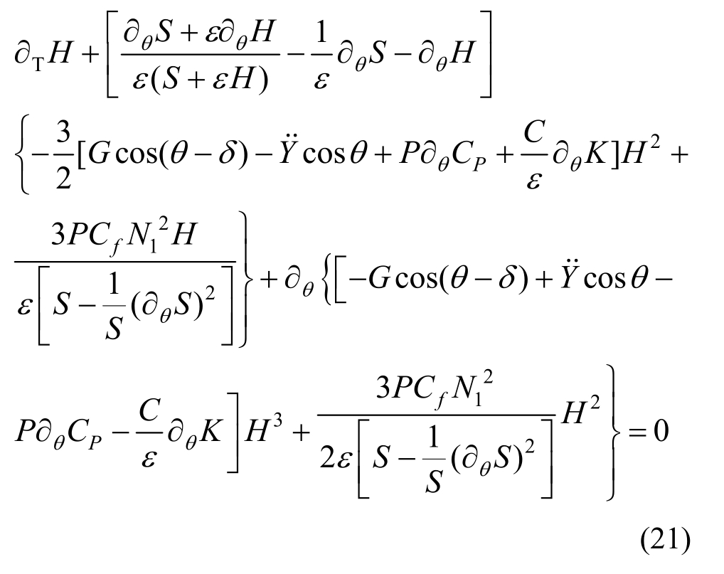 式(21)即为在风雨共同作用下,任意二维横断面斜拉索表面水膜的运动方程。当斜拉索表面形状为标准圆,即s(θ)=R,S=1时,式(21)与Lemaitre等[21]和Reisfeld等[22]推导出的方程相同。