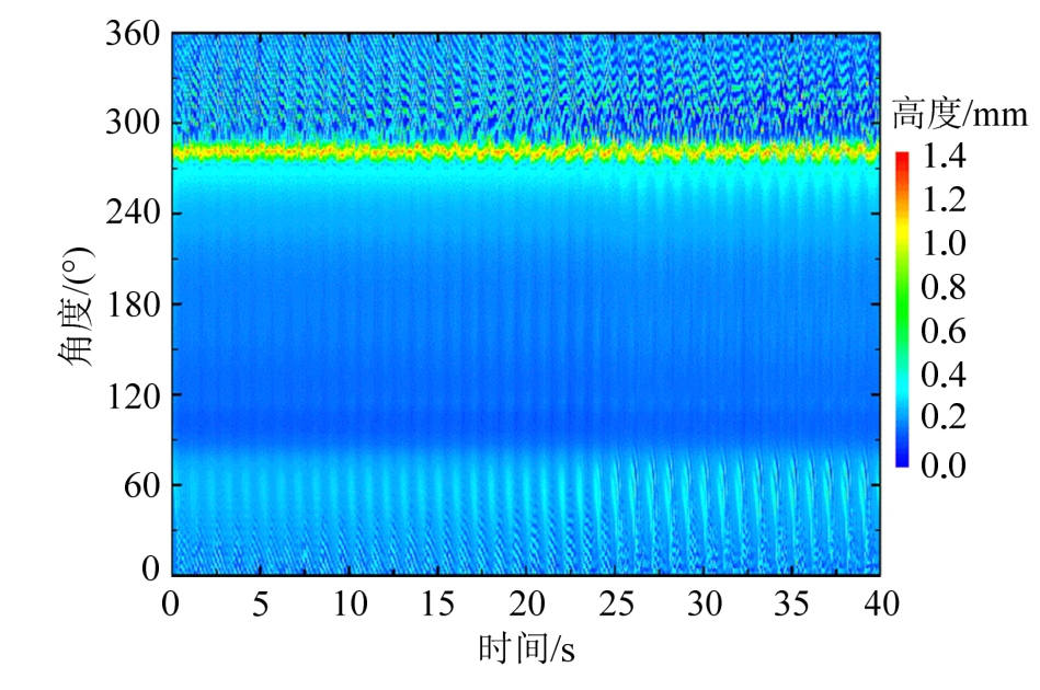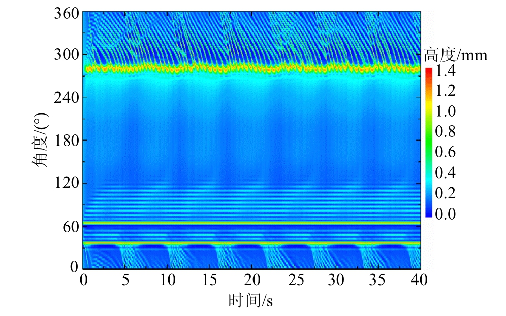 图12显示的是0~40 s内斜拉索表面水膜厚度变化时程图,可以看出,在t≈0.5s时下水线形成于θ=278.4°附近,随后在θ=275.6°~286.9°范围内振荡,其高度和宽度分别为hl=1.25 mm和bl=2.62 mm。由于两个纵向肋条均处于上水线的周期性变化范围内,影响了上水线的形成及周期性滑落,可以看到有三条较为明显的水线形成,水线变化的周期性并不明显,最大厚度为0.43 mm,并且由于肋条的存在阻碍了水沿斜拉索表面的流动,在两个肋条的上边缘均积聚了一部分水,形成两条固定的水线,水线厚度约为1.2 mm,在两个肋条的下边缘也积聚少量的水,厚度约为0.26 mm,说明斜拉索表面上水线附近的水主要从迎风面流向下水线。为了进一步的分析斜拉索表面上水线运动的周期性特性,现选取θ=56.25°处斜拉索表面水膜为研究对象,作0~40 s内水膜厚度变化的时程曲线及如图13所示。通过频谱分析可知,水线振荡的主频为0.98 Hz和14.45 Hz。通过与圆形斜拉索算例的研究成果进行对比可以发现:在重力、表面张力和风荷载的作用下,上水线附近其余位置处的水膜本应向上水线汇聚,而斜拉索表面的纵向肋条抑制了上水线的形成,一部分水积聚在纵向肋条的上下边缘,另一部分水在两个纵向肋条之间形成了多条上水线,而与圆形斜拉索模型中的上水线相比,厚度却明显变薄。两个纵向肋条虽不能抑制上水线的产生,却可以减小上水线的厚度,并且由于两个纵向肋条均位于上水线的周期性滑落范围内,使得上水线振荡范围减小,多条水线在运动过程中相互影响,导致水线的变化频率与斜拉索的自振频率并不十分一致,水线在14.45 Hz处也有较大的能量,斜拉索升力变化的周期性特性减弱,从而使得斜拉索振幅大幅度减小,抑制了风雨激振现象的产生。