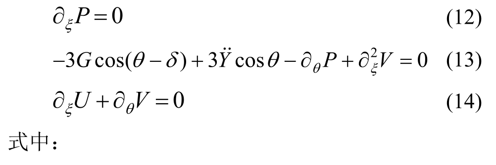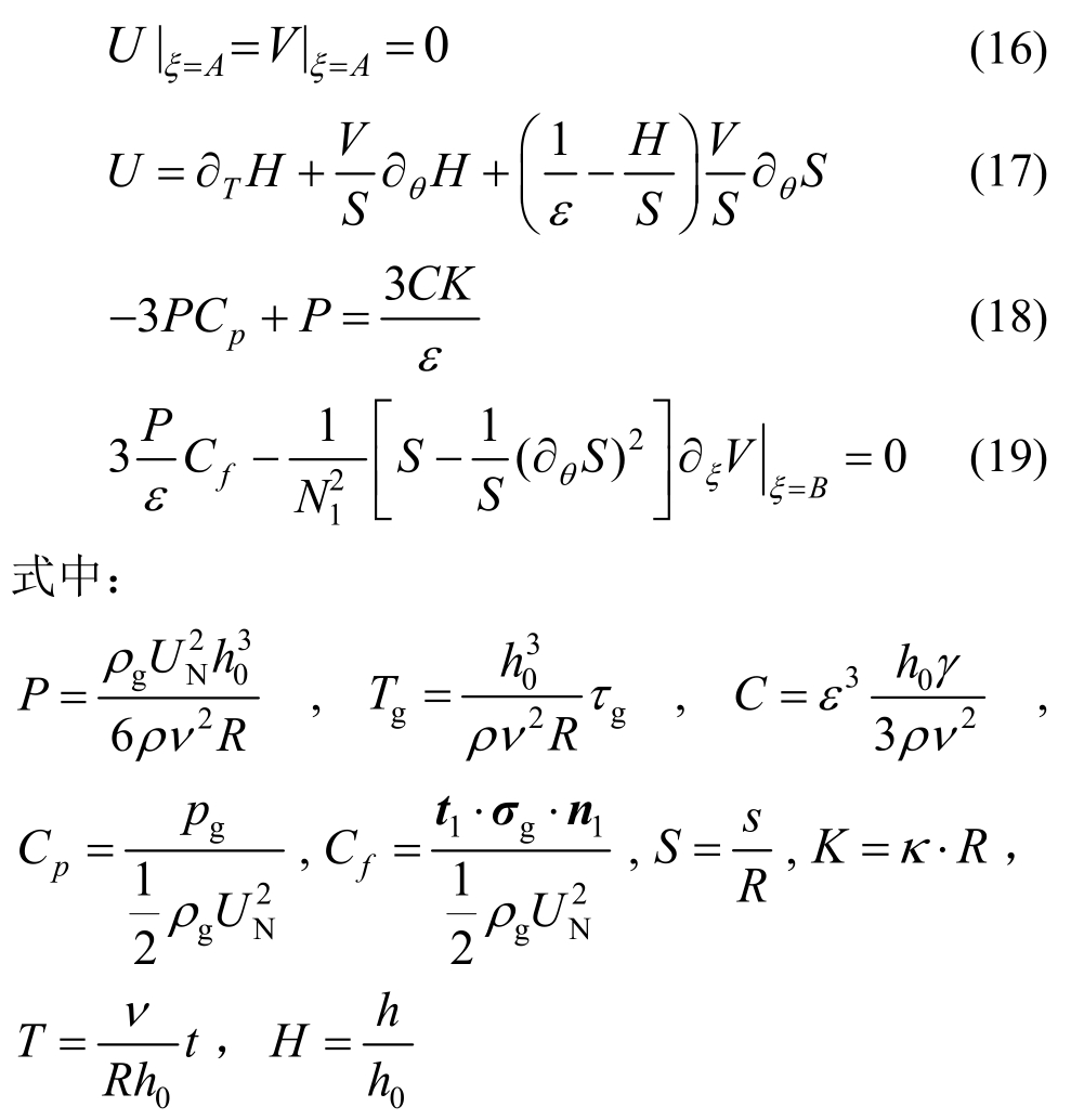 将三个边界条件式(16)~式(19)代入方程组式(12)~式(14)化简得到无量纲的水膜运动方程: