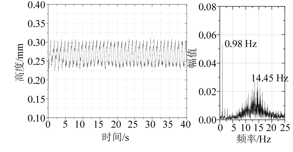 图7显示了0~40 s内斜拉索表面水膜形态的变化情况。可以看出,上水线发生明显的周期性变化,而下水线基本不发生振荡。而上水线在θ=30°~75°之间振荡,与试验观测数据一致。为了研究斜拉索表面上水线的变化规律,现选取上水线附近的某位置θ=56.25°处水膜厚度作为研究对象,如图8所示。在前 25 s内上水线厚度不断增大,之后保持在0.49 mm左右,近似等于试验观测数据 0.51 mm。经频谱分析得到上水线的振荡频率是1 Hz,与试验中频谱分析结果0.952 Hz非常接近。为便于与带有纵向肋条斜拉索的升力变化情况进行对比分析,现列出斜拉索气动升力的时程曲线及频谱分析如图 9所示,稳定以后升力的变化范围为0~1.3 N,振动的主频率为1 Hz。