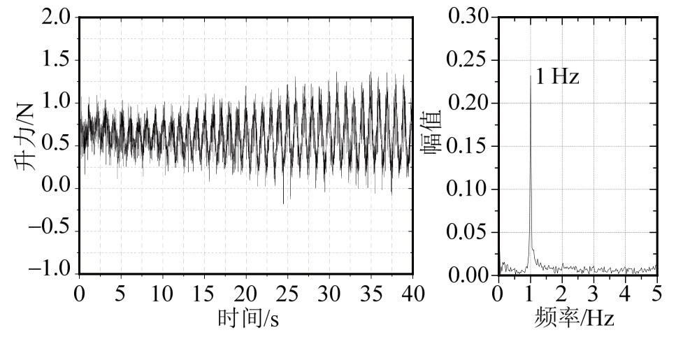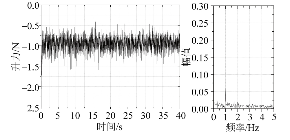 图11是0~40 s内斜拉索气动升力的时程曲线及频谱分析,在t≈1 s以后升力基本在-1.4 N~-0.6 N之间保持周期性稳定变化,升力的变化主频为0.98 Hz,但能量很小,基本可以忽略。对比图9的升力变化时程曲线及频谱分析可以发现,斜拉索升力变化范围减小,周期性特性明显减弱。