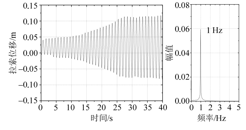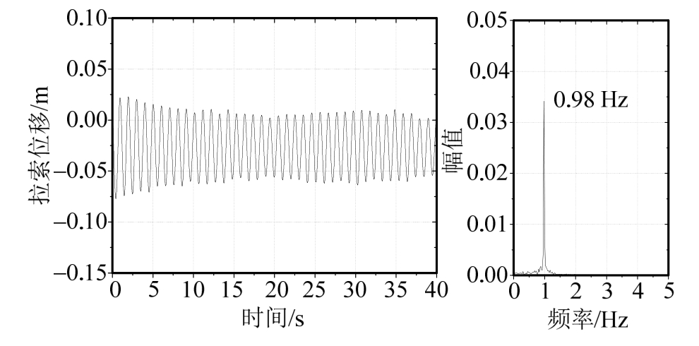图6显示在0~40 s内斜拉索振动响应及频谱分析。从图5所示的斜拉索振动时程曲线可以看出,斜拉索的初始时刻振幅为0.02 m,之后不断增大,在27 s以后逐渐保持稳定,振幅达到0.10 m,与试验观测结果0.09 m非常接近。斜拉索的振动主频率是1 Hz,近似等于文献[23]中得到的0.952 Hz。
