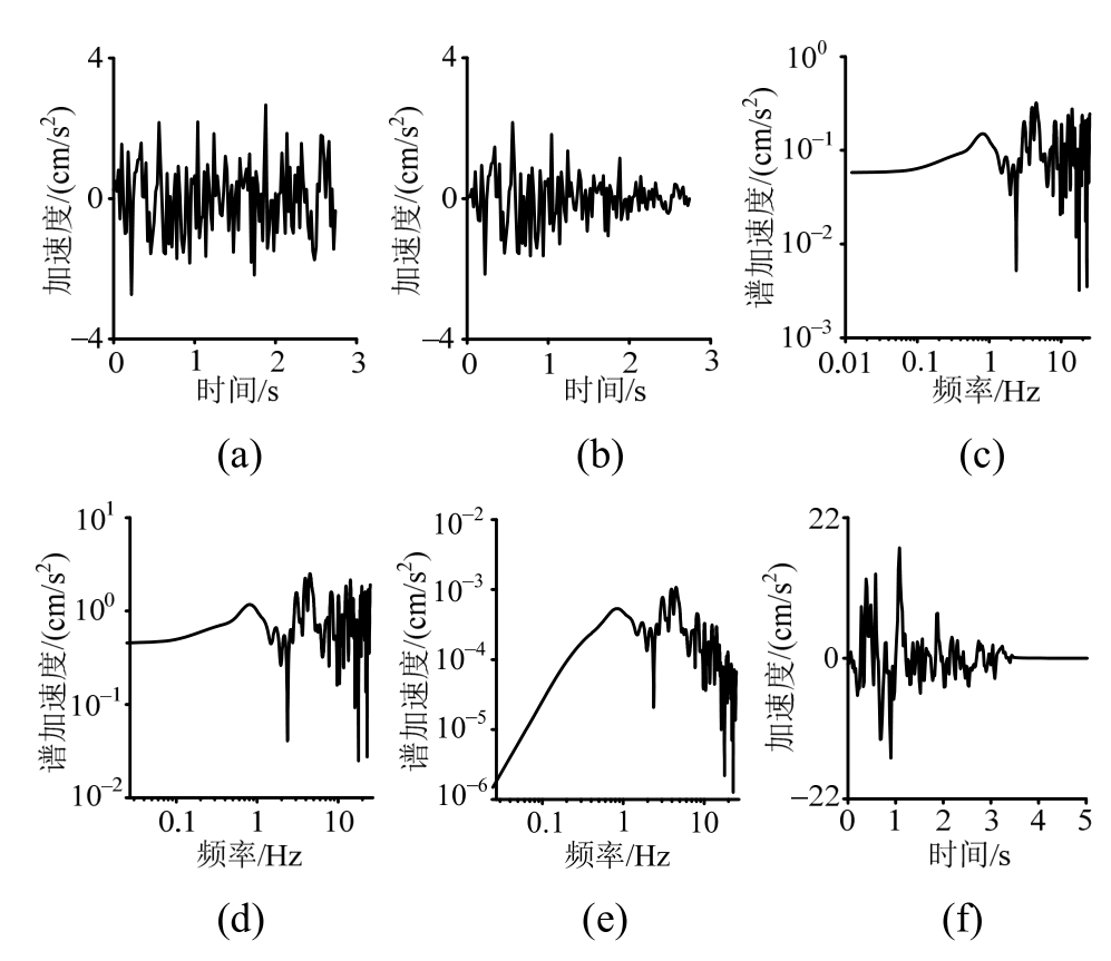 点源地震动随机合成方法,是用一条有限带宽的高斯白噪声来表征地震动相位的随机特性,与考虑震源、传播途径和场地影响的幅值谱结合,通过傅里叶逆变换(IFFT)得到地震动时程[25]。模拟从建立有限持时的高斯白噪声时程开始(图 2(a)),并用一个恰当的时程包络函数将白噪声形状调整为与真实地震动相近,即从小渐大至持续平稳振动再逐渐减弱的过程(图 2(b))。借助 FFT,在频域中对幅值谱(图 2(c))进行归一化 (图 2(d))。然后,用一个描述震源效应、传播途径效应和局部场地效应的确定性的幅值谱,来调整该归一化谱(图 2(e)),再借助IFFT得到加速度时程(图2(f))。