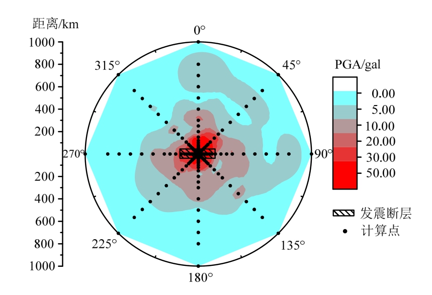 为保证模拟地震动覆盖不同方位的地震动差异,模拟时选择以发震断层为中心的均匀的八个方向,每个方向设定 24个场点,其至断层中心距离分别为1 km、2 km、5 km、10 km、15 km、20 km、30 km、40 km、50 km、60 km、70 km、80 km、100 km、120 km、150 km、200 km、250 km、300 km、400 km、500 km、600 km、700 km、800 km、1000 km(如图 4)。对于任一场点,设定震级从起算震级4.0开始,以0.5为间隔,一直算到8.0,共9档。为充分表达参数不确定性和相位随机性的影响,对每一场点、每一个震级档进行 300次随机地震动合成。即,对192(24×8)个场点,进行 518400(192×9×300)次地震动加速度时程模拟[1]。图4中即为一次地震动合成给出的192个场点PGA分布图。